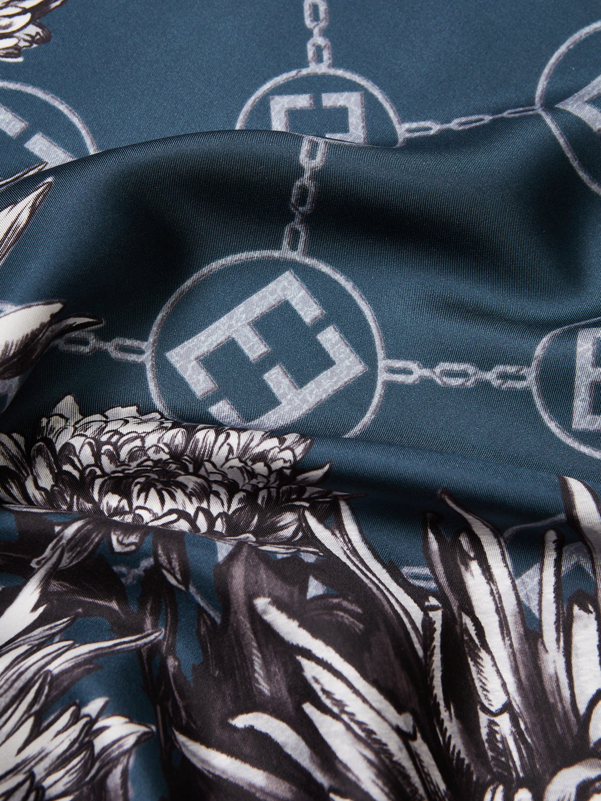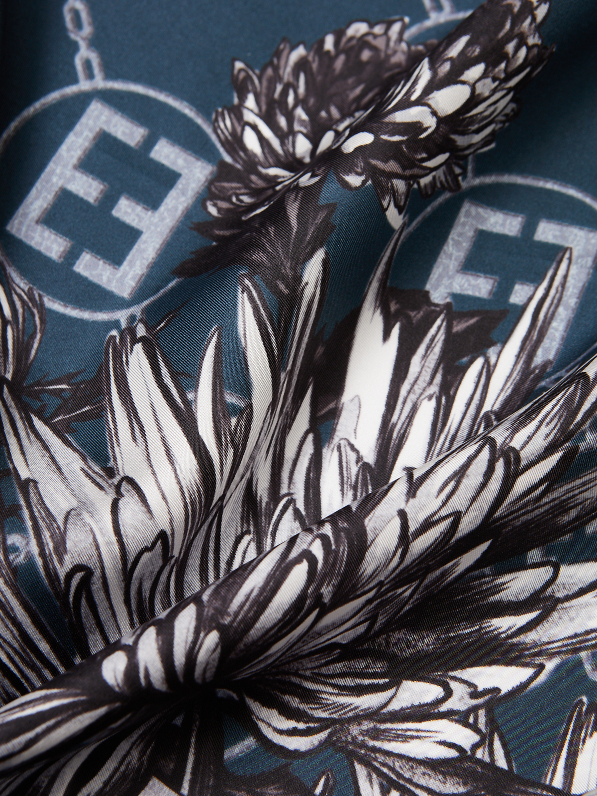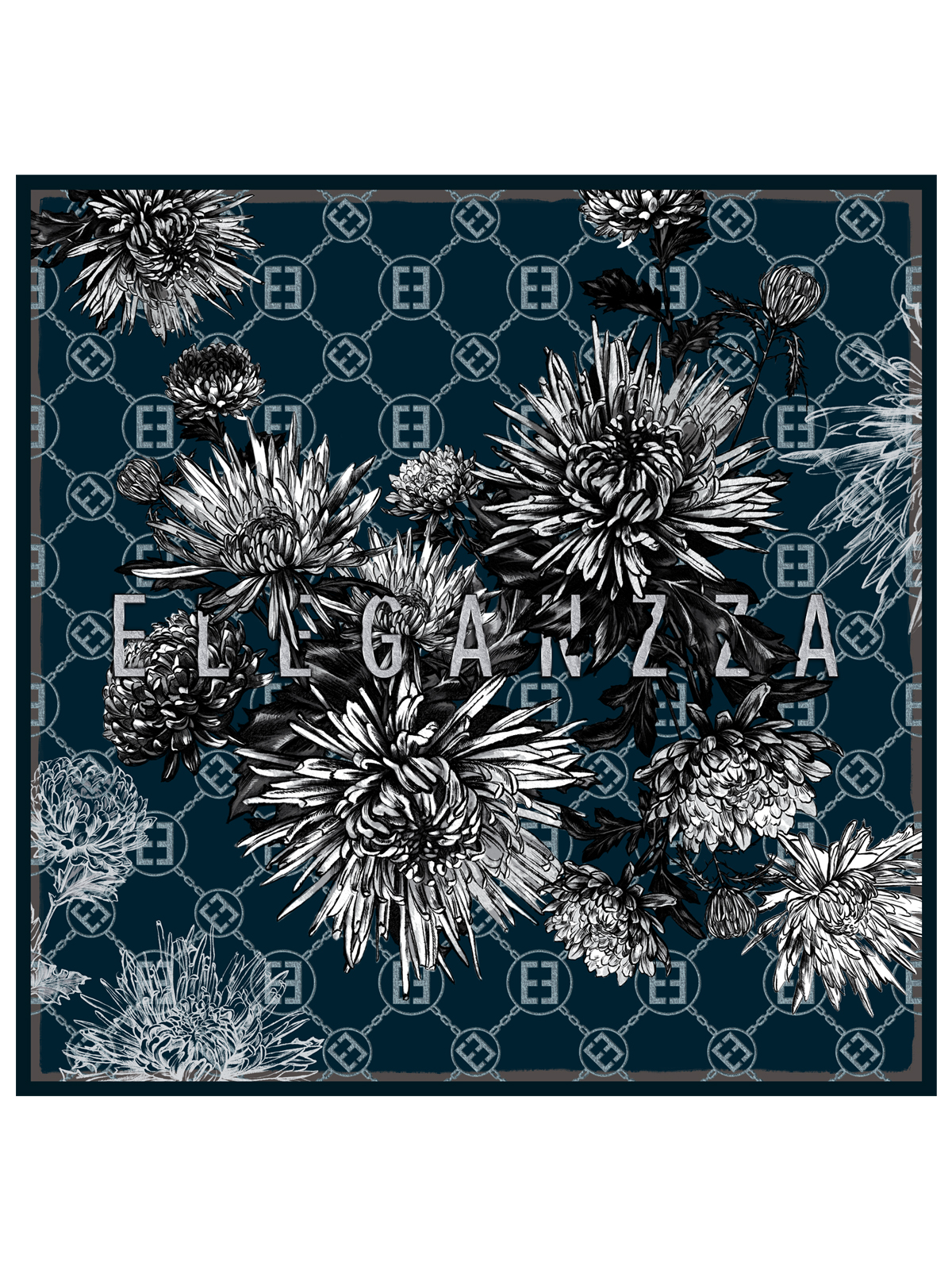 Платок женский торговой марки ELEGANZZA выполненный из натурального шелка. Графичные астры выполненные в эффекте угольного эскиза органично переплетаются с фирменным логотипом бренда. Рисунок размещен на фоне имитации жаккардового фона с повторяющимися эмблемами создавая глубину и узнаваемый стиль. Деликатная ручная работа - подгибка на лицевую сторону.