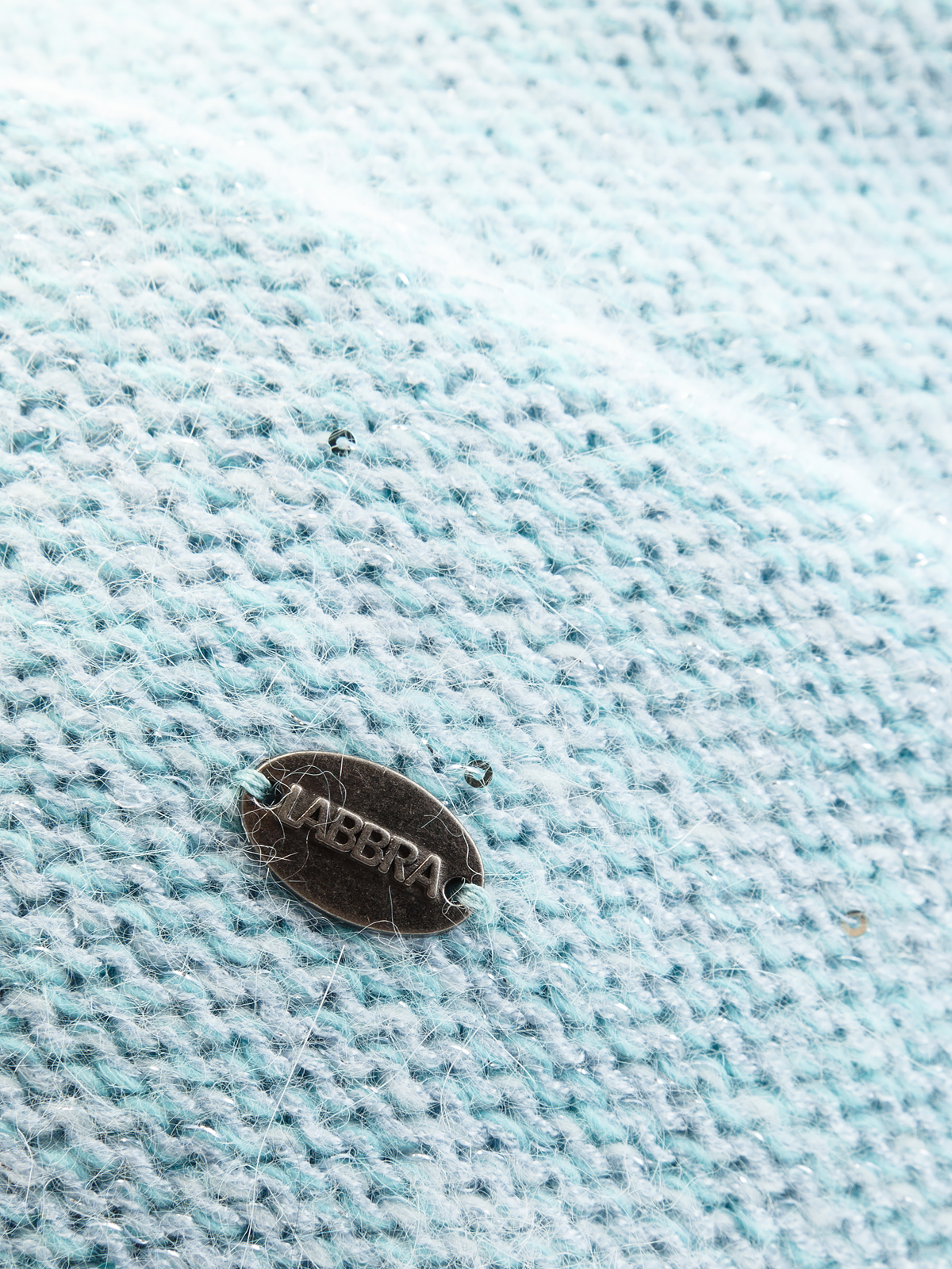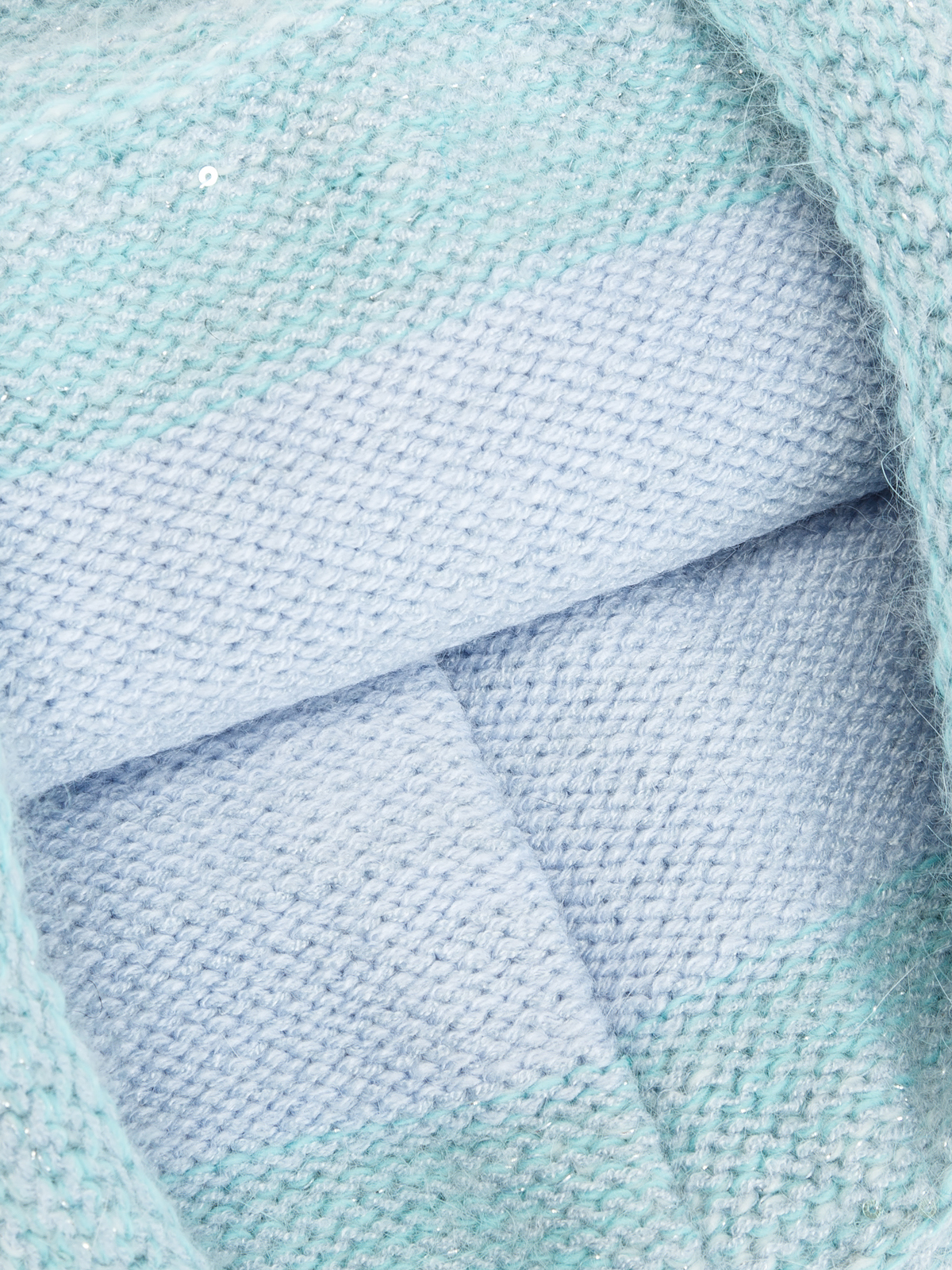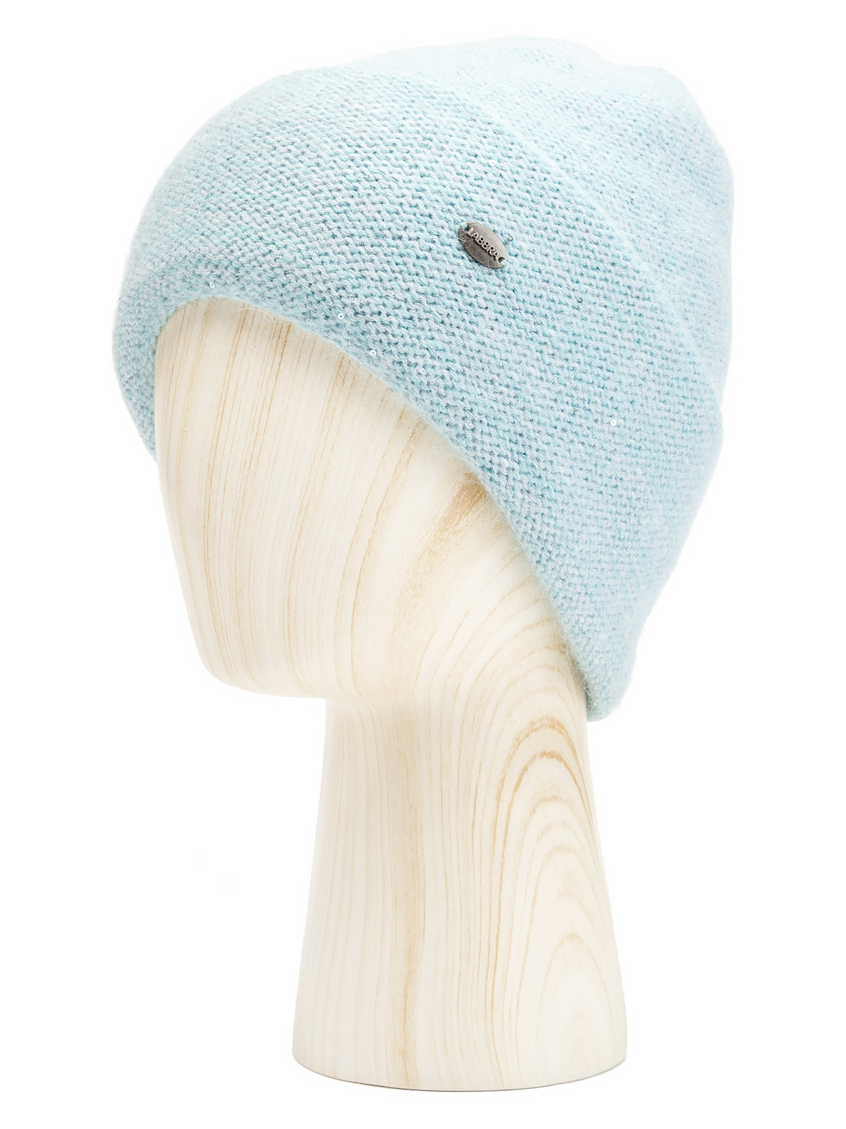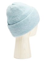 Шапка бини с широким отворотом выполнена из пряжи с высоким содержанием ангоры. Шапка теплая на дополнительной подвязе. Деликатная изнаночная вязка со вставкой нити люрекса и мерцающих пайеток создает женственный современный вид который делает аксессуар особенно актуальным.