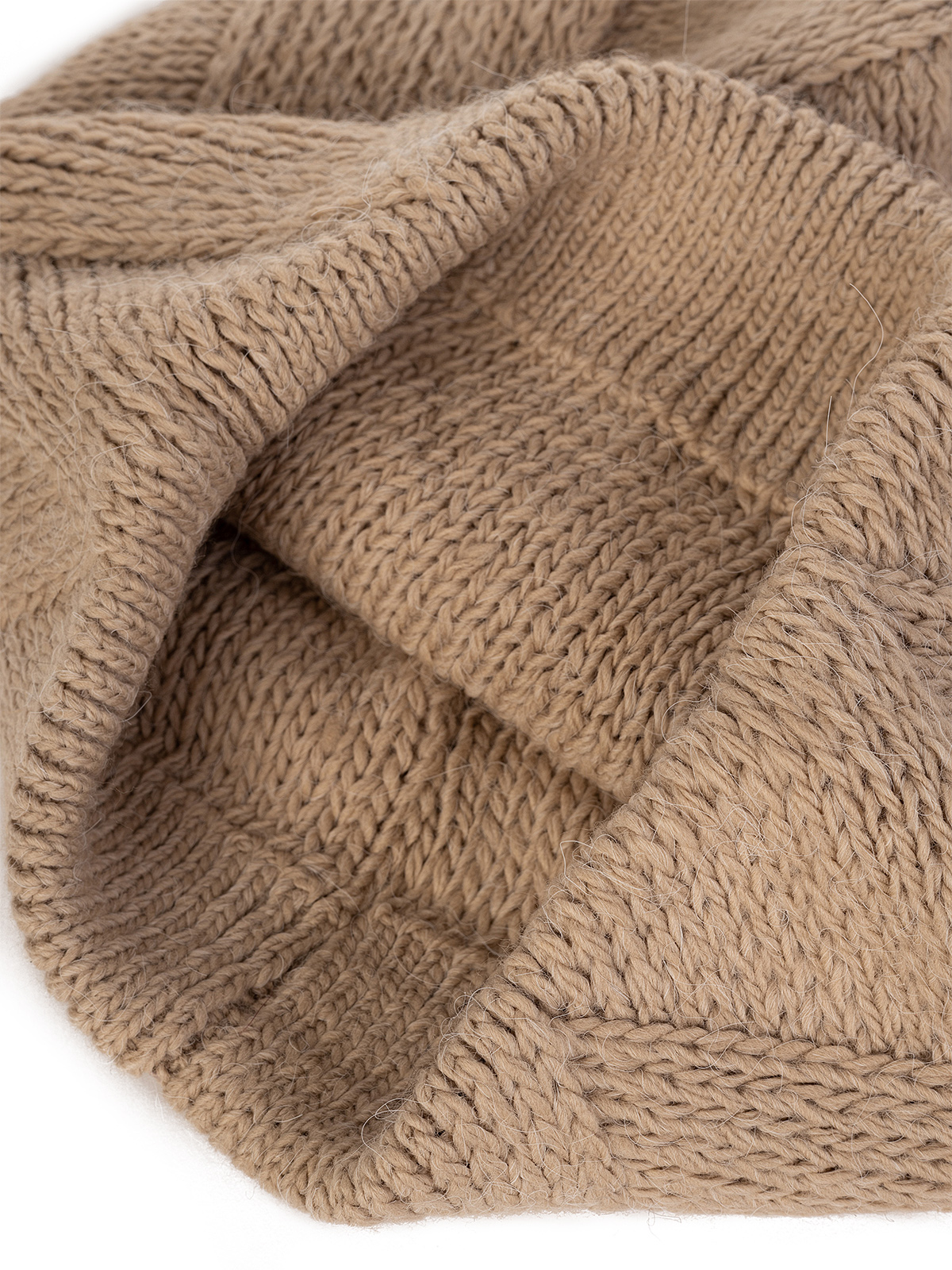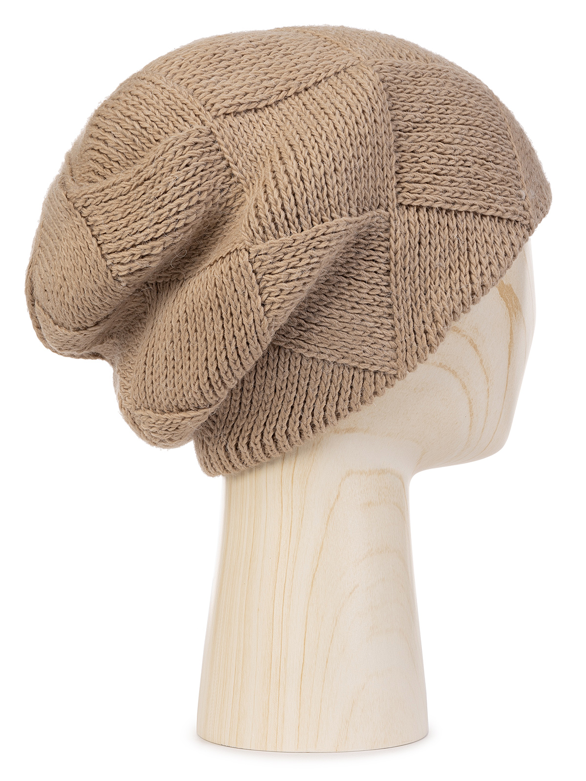 Классическая модель шапки-бини увеличенного обьема. Необычный и модный рисунок шахматной вязки выполнен из полушерстяной пряжи. Такая конструкция шапки легко драпируется на затылочной части. Модель на подкладке с 50% шерсти станет прекрасным теплым и стильным аксессуаром.