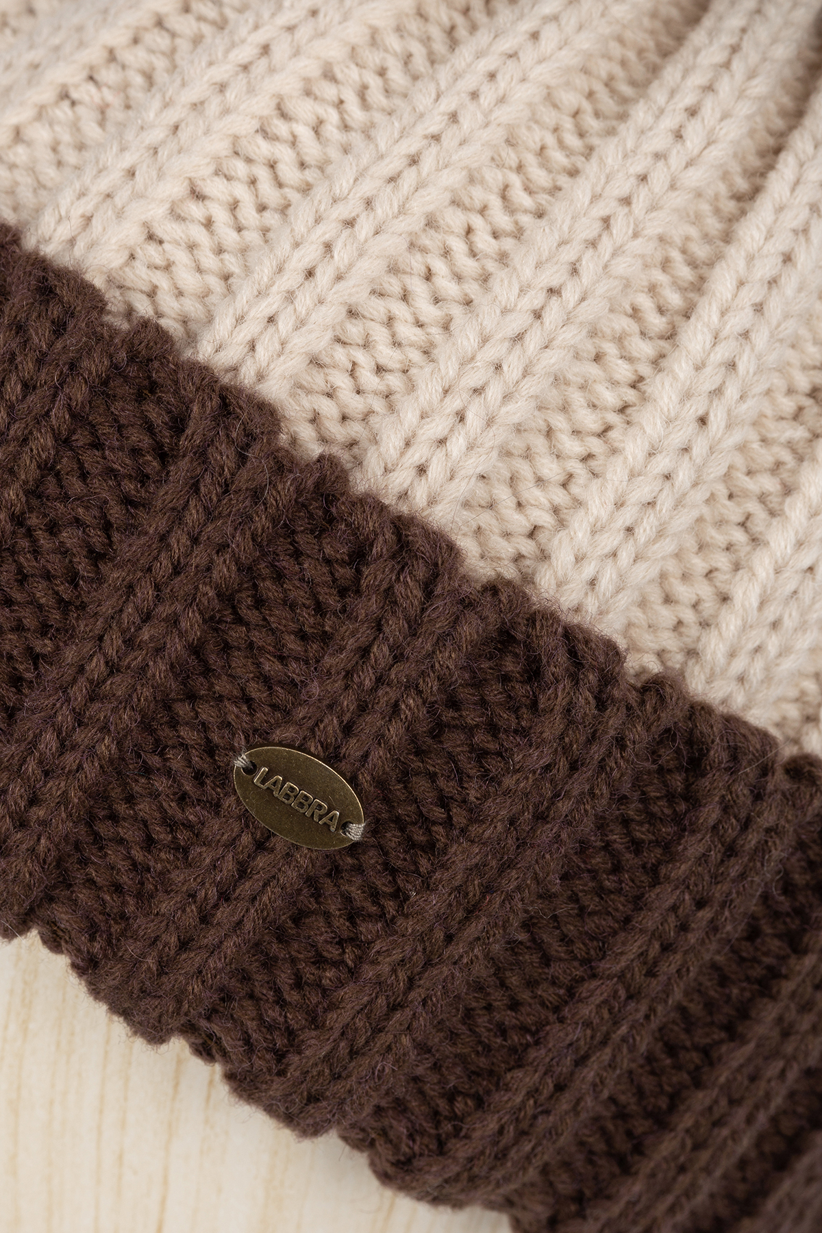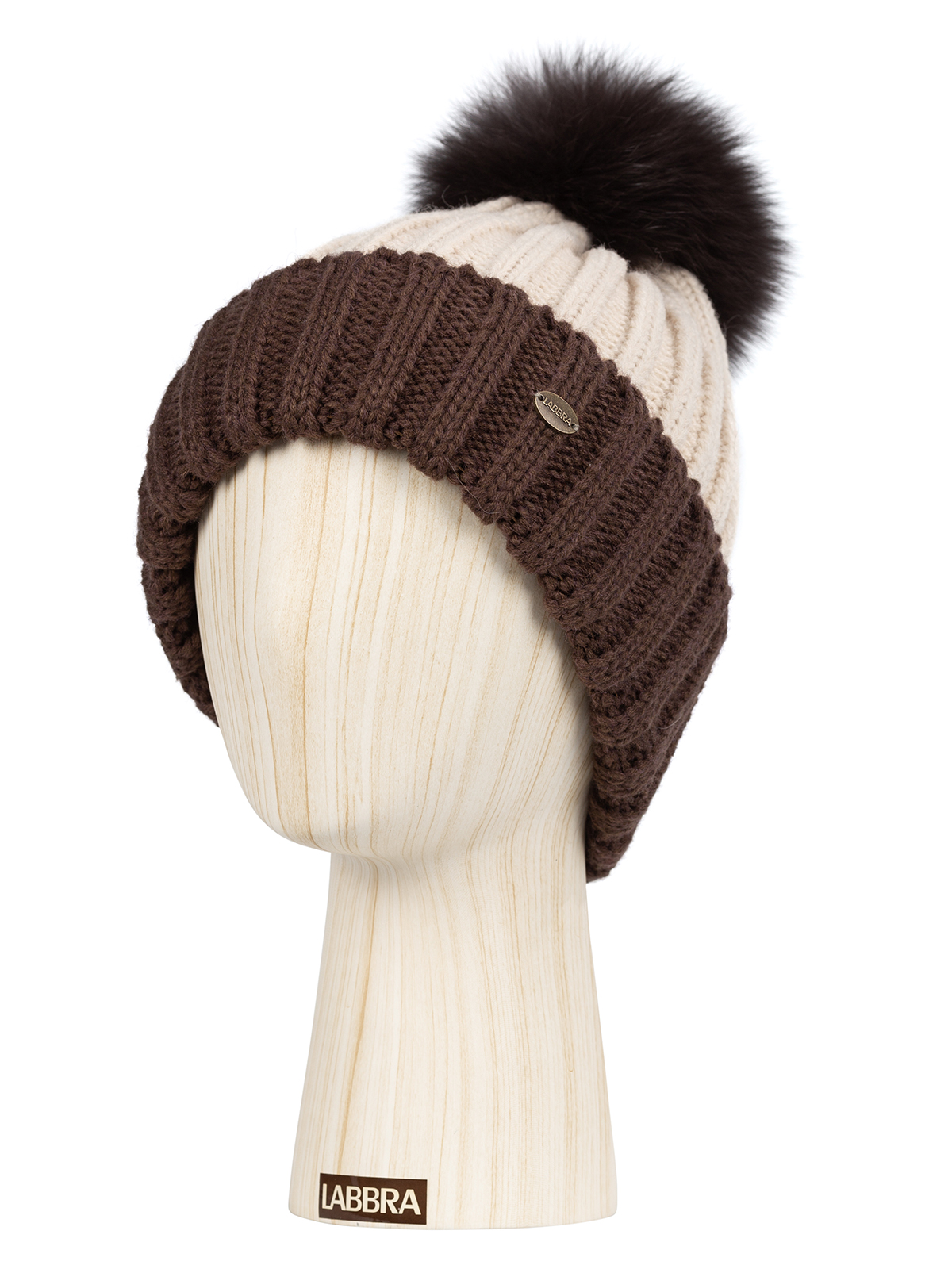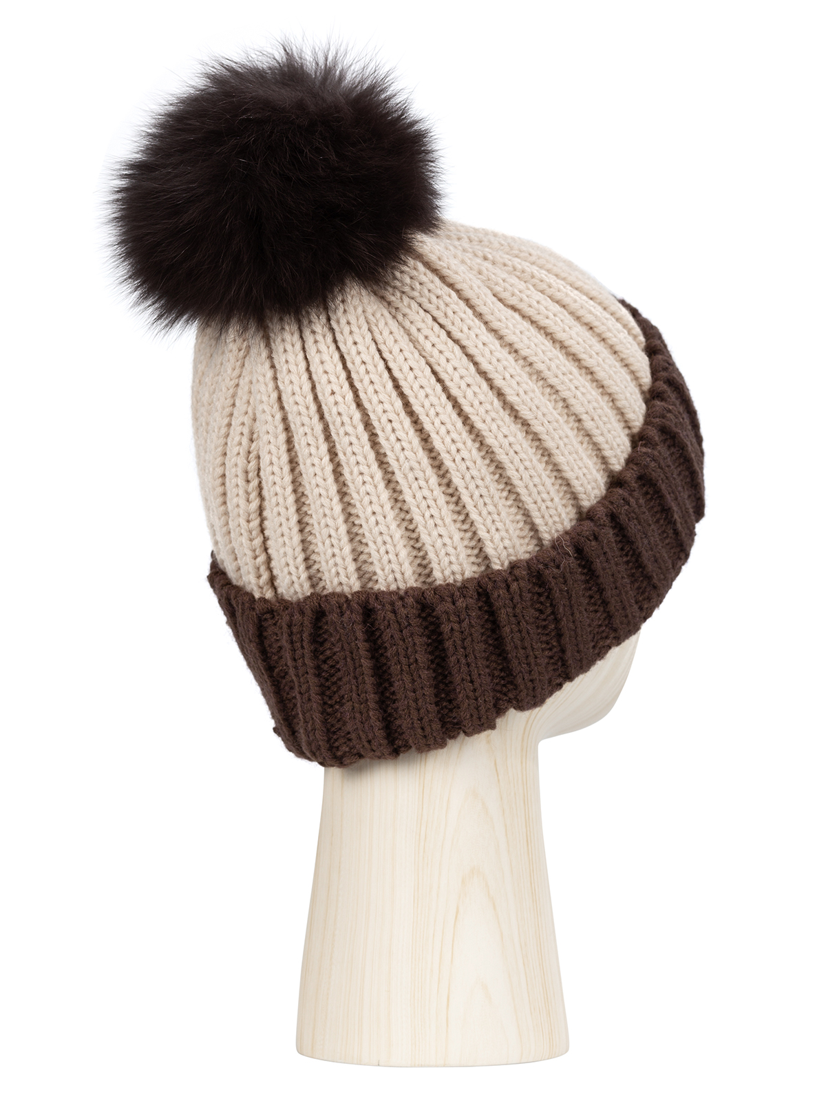 Стильная шапка выполнена рельефной вязкой резинкой" в ярких модных сочетаниях. Украшена помпоном из натурального меха лиса. Помпон съемный - на кнопке что позволяет легко ухаживать за изделием! Натуральный мех лисы не потеряет форму даже в самый сильный снегопад!"