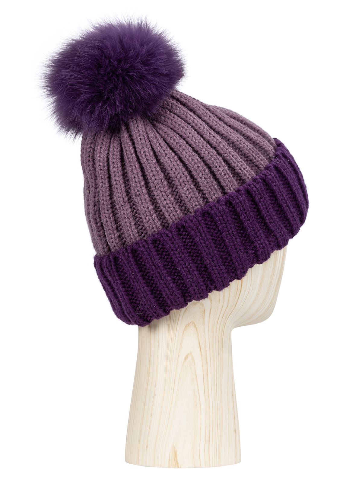 Стильная шапка выполнена рельефной вязкой резинкой" в ярких модных сочетаниях. Украшена помпоном из натурального меха лиса. Помпон съемный - на кнопке что позволяет легко ухаживать за изделием! Натуральный мех лисы не потеряет форму даже в самый сильный снегопад!"