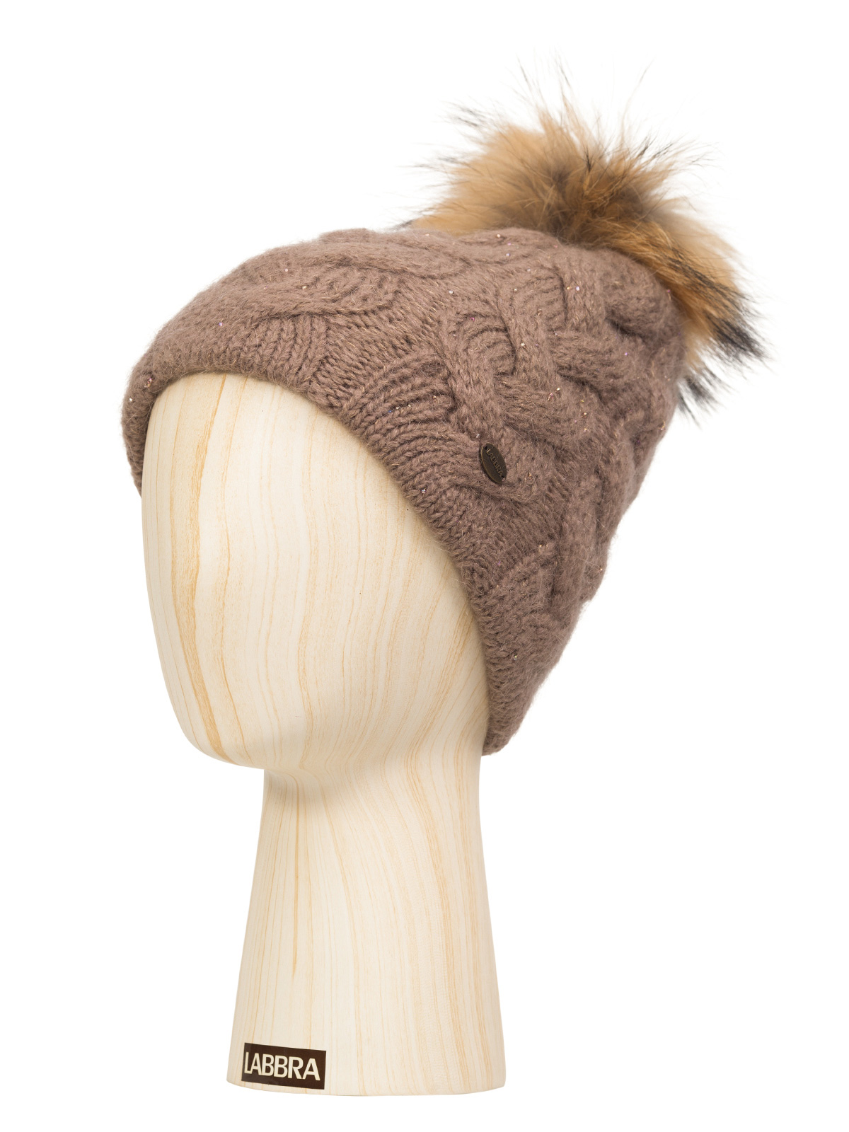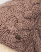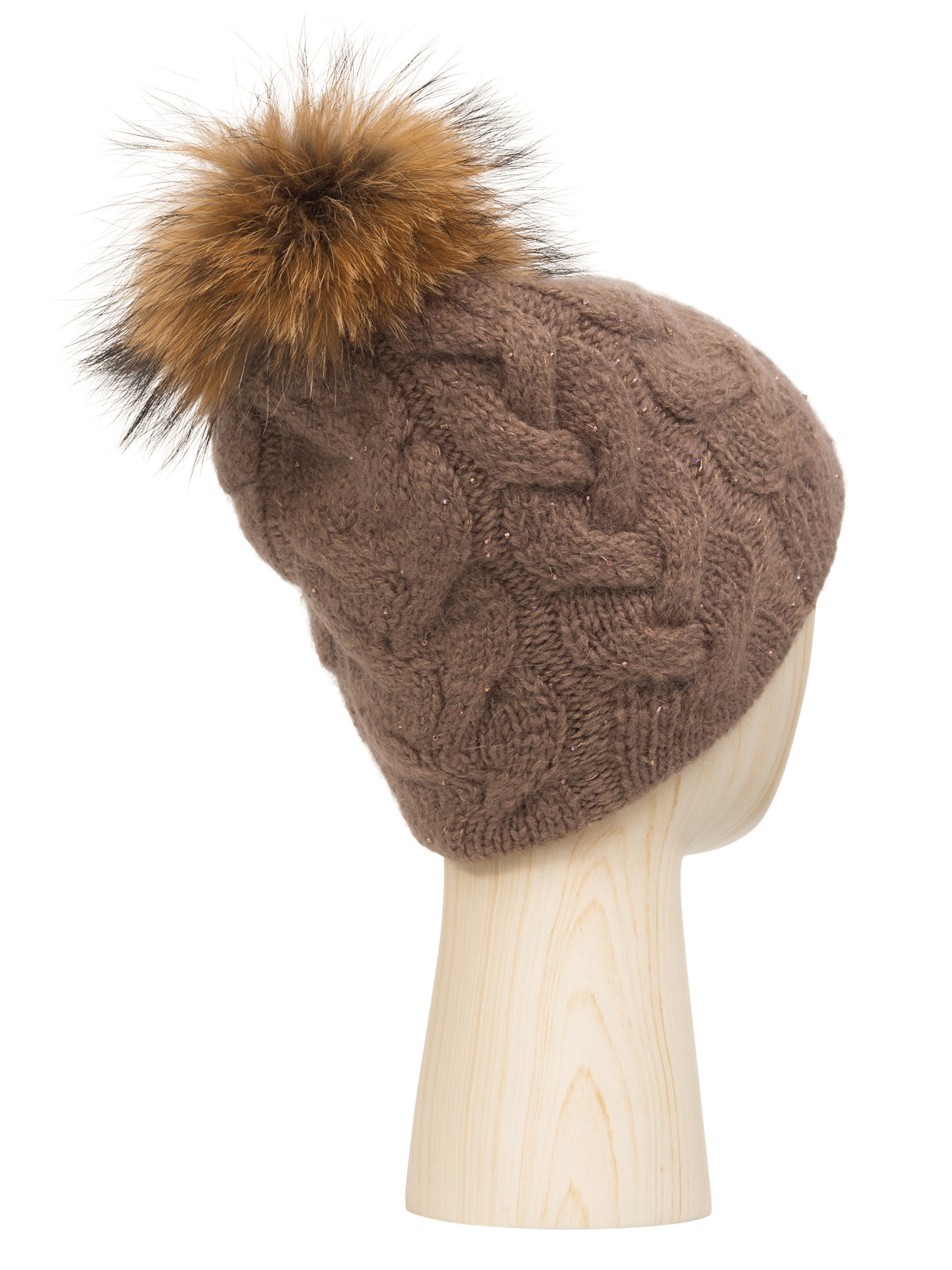 Классическая форма шапки-бини выполнена из смесовой пряжи с мохером в составе. А деликатное вплетение нити с мелким бисером делает ее особенной. Максимально сохраняет тепло и обеспечивает удобную посадку теплый шерстяной подвяз. Классическая вязаная шапка оформлена съемным помпоном из натурального меха енота.