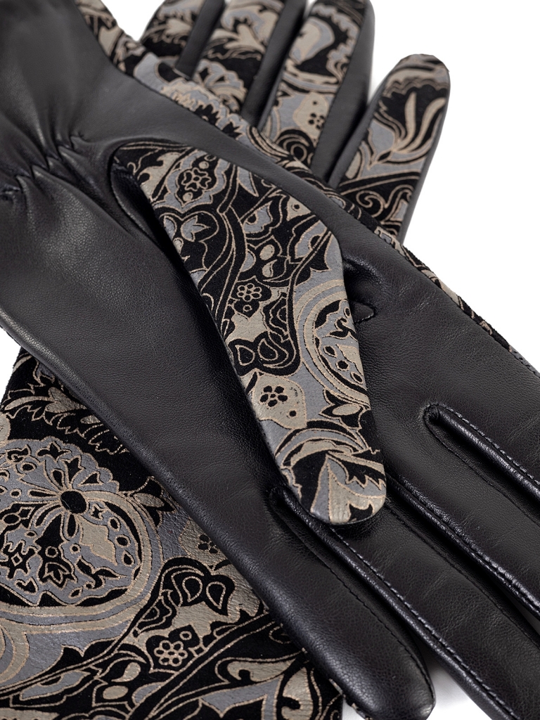 Перчатки женские торговой марки ELEGANZZA из натуральной кожи ягненка. Производство Италия. Подкладка: 85% шерсть, 15% кашемир. Лицевая сторона перчатки выполнена из натурального велюра с дизайнерским принтом PAISLEY, ладонная часть из натуральной кожи ягненка. Длина манжеты от нижней точки большого пальца до края перчаток - 7 см. Длина пальцев - средняя. Подкладка перчатки: Шерсть/кашемир Страна бренда: Италия
