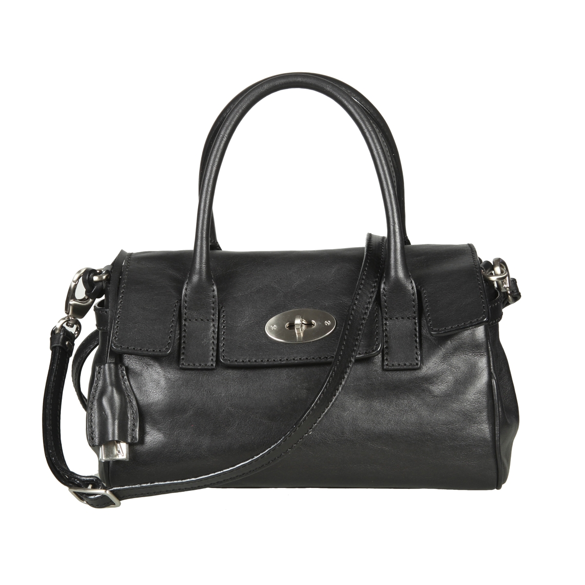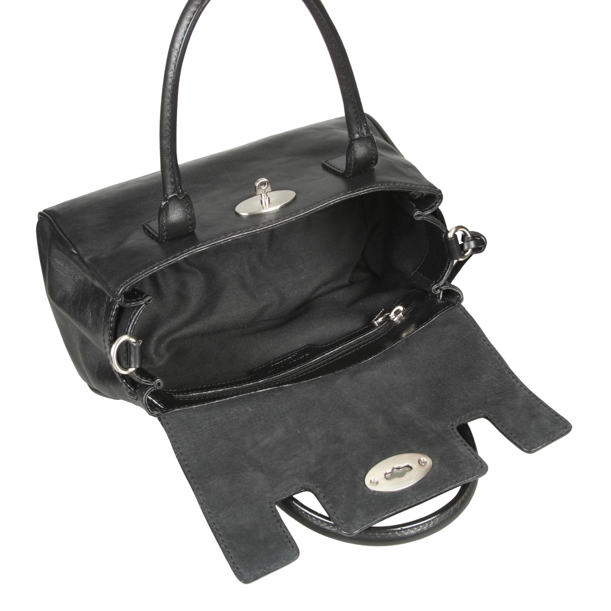 Сумка закрывается клапаном на классическом замке, внутри один отдел, в котором на задней стенке - карман для документов на молнии, на передней стенке - два кармашка для мелких предметов, отделение для авторучек, оснащена съёмным регулируемым плечевым ремнём, замочек с ключом