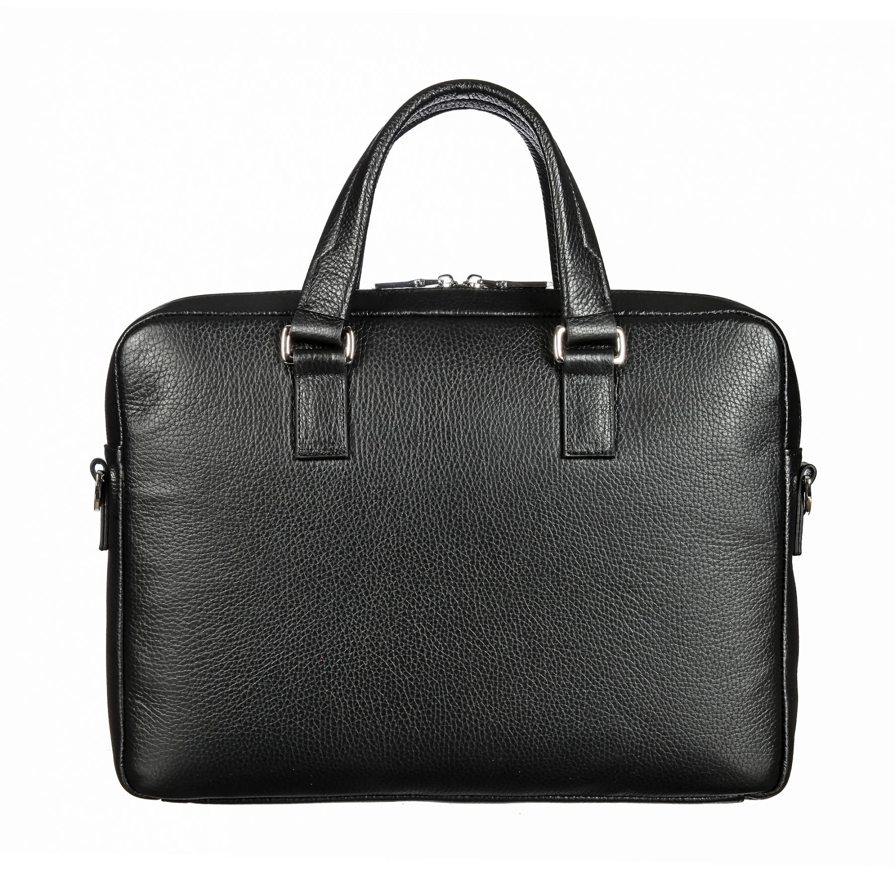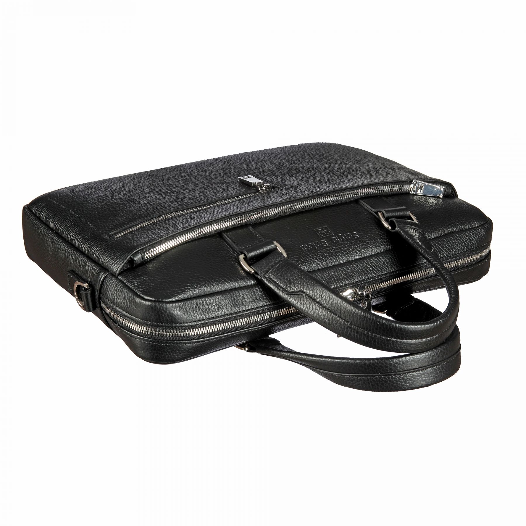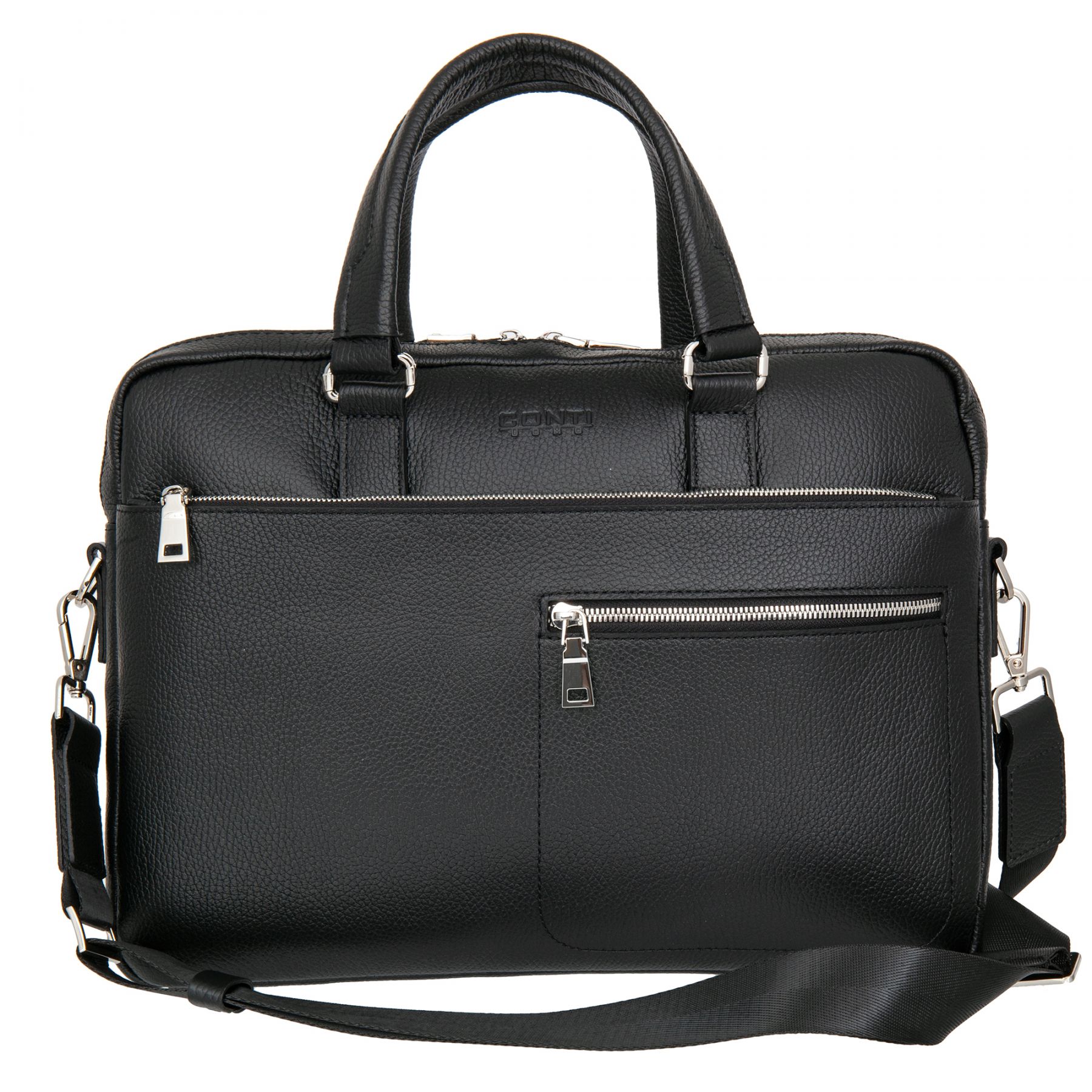 Сумка из натуральной кожи чёрного цвета, закрывается на двухстороннюю молнию, Внутри один основной отдел, отделение для планшета на липучке, карман для документов на молнии, два кармашка для мелких предметов. Снаружи на лицевой стенке два кармана на молнии. Оснащена съёмным регулируемым плечевым ремнём на карабинах.