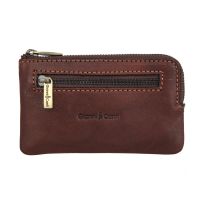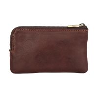 Вместительная кожаная ключница коричневого цвета. Закрывается на молнию. Внутри одно отделение для ключей с двумя кольцами на цепочках. На передней стенке кармашек на молнии.
