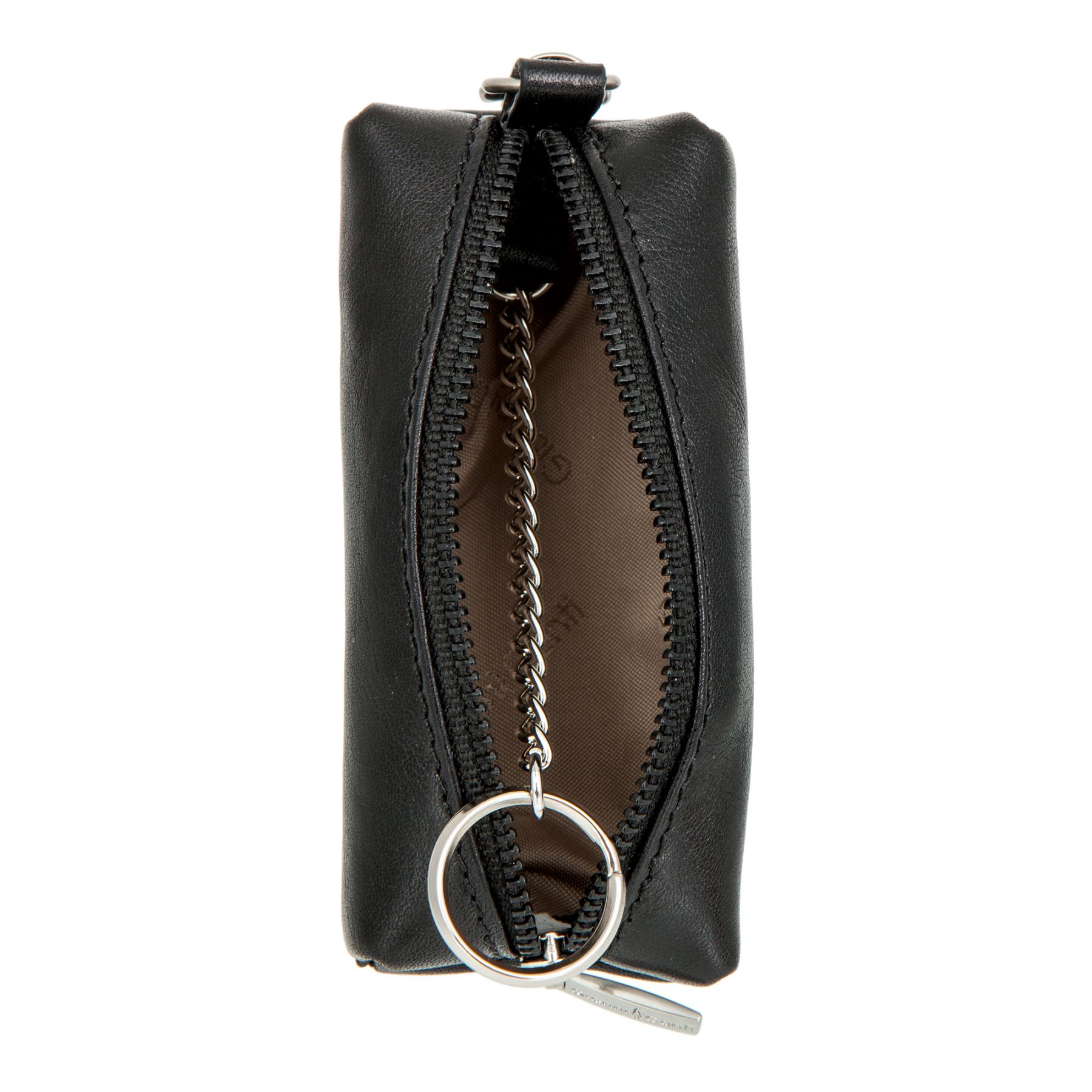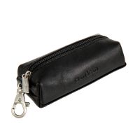 Внутри два кольца для ключей, снаружи карабин. Закрывается на молнию.