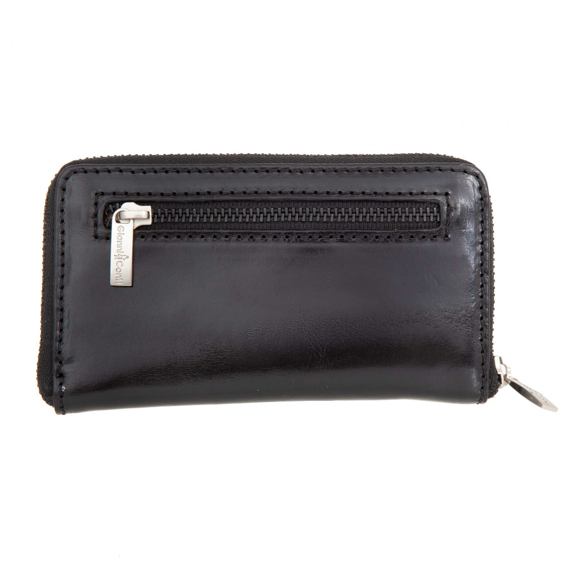 Чёрная кожаная ключница от бренда Gianni Conti. Закрывается на молнию. Внутри шесть колец для ключей и съёмный кожаный брелок с кольцом, крепится на две кнопки. Цвет фурнитуры - серебро.