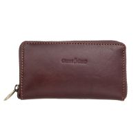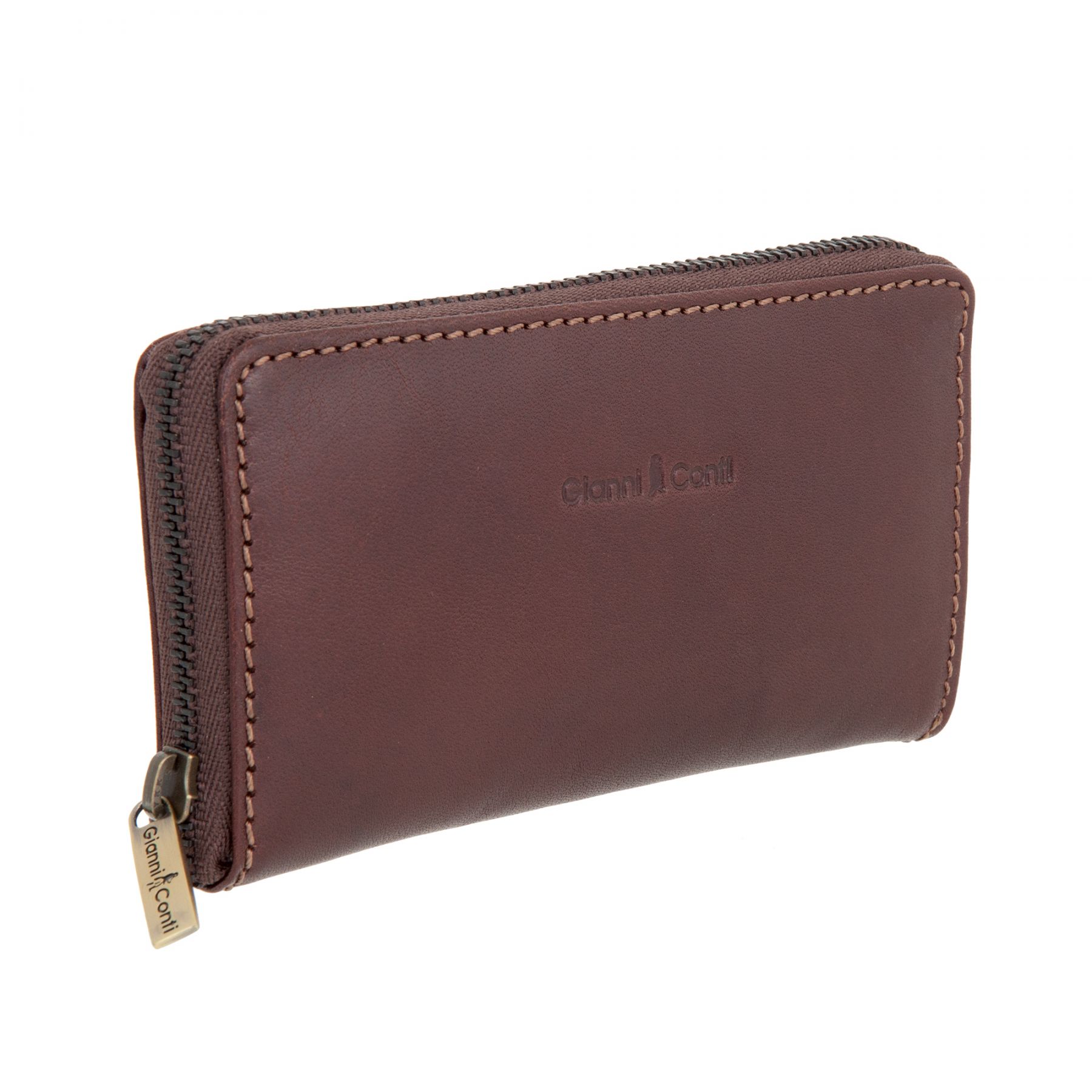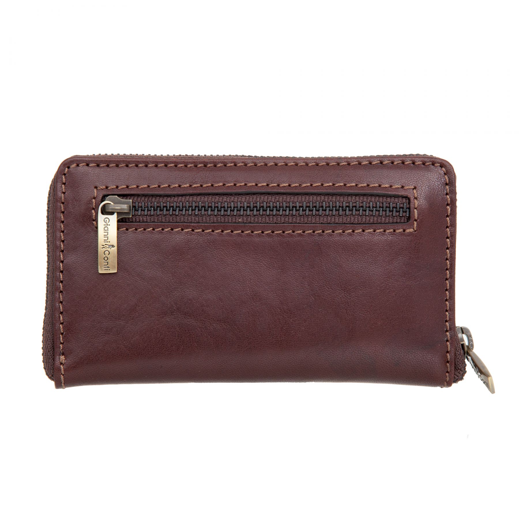 Коричневая кожаная ключница от бренда Gianni Conti. Закрывается на молнию. Внутри шесть колец для ключей и съёмный кожаный брелок с кольцом, крепится на две кнопки. Цвет фурнитуры - патинированная латунь.