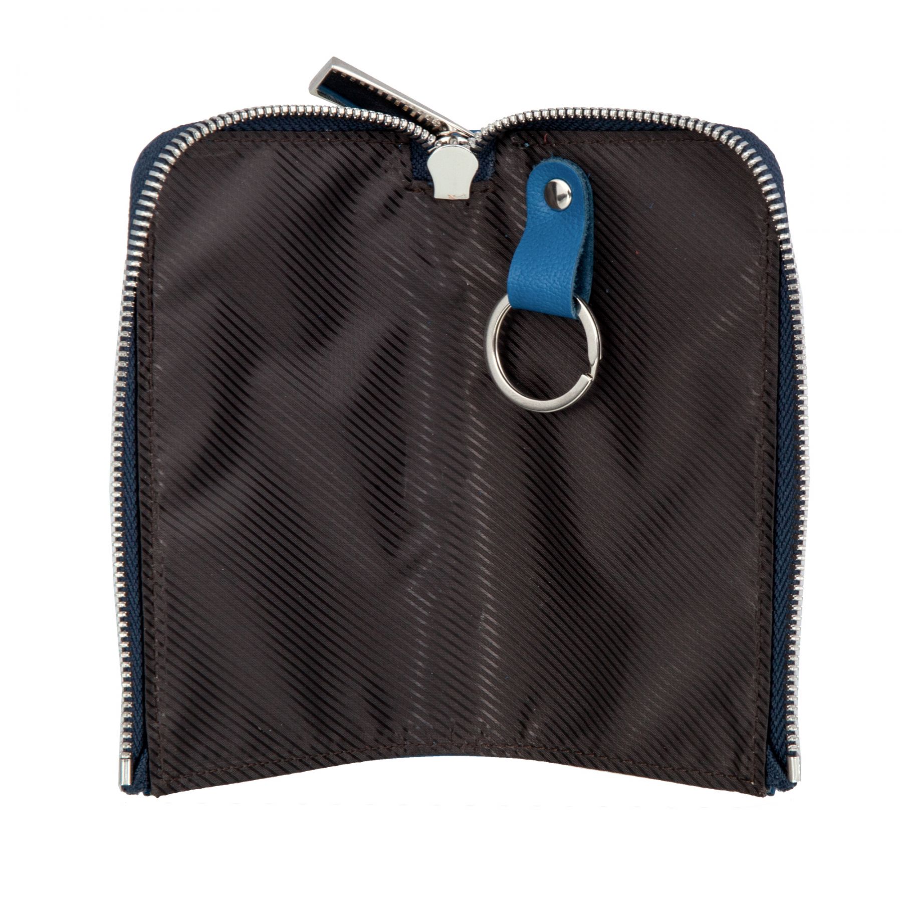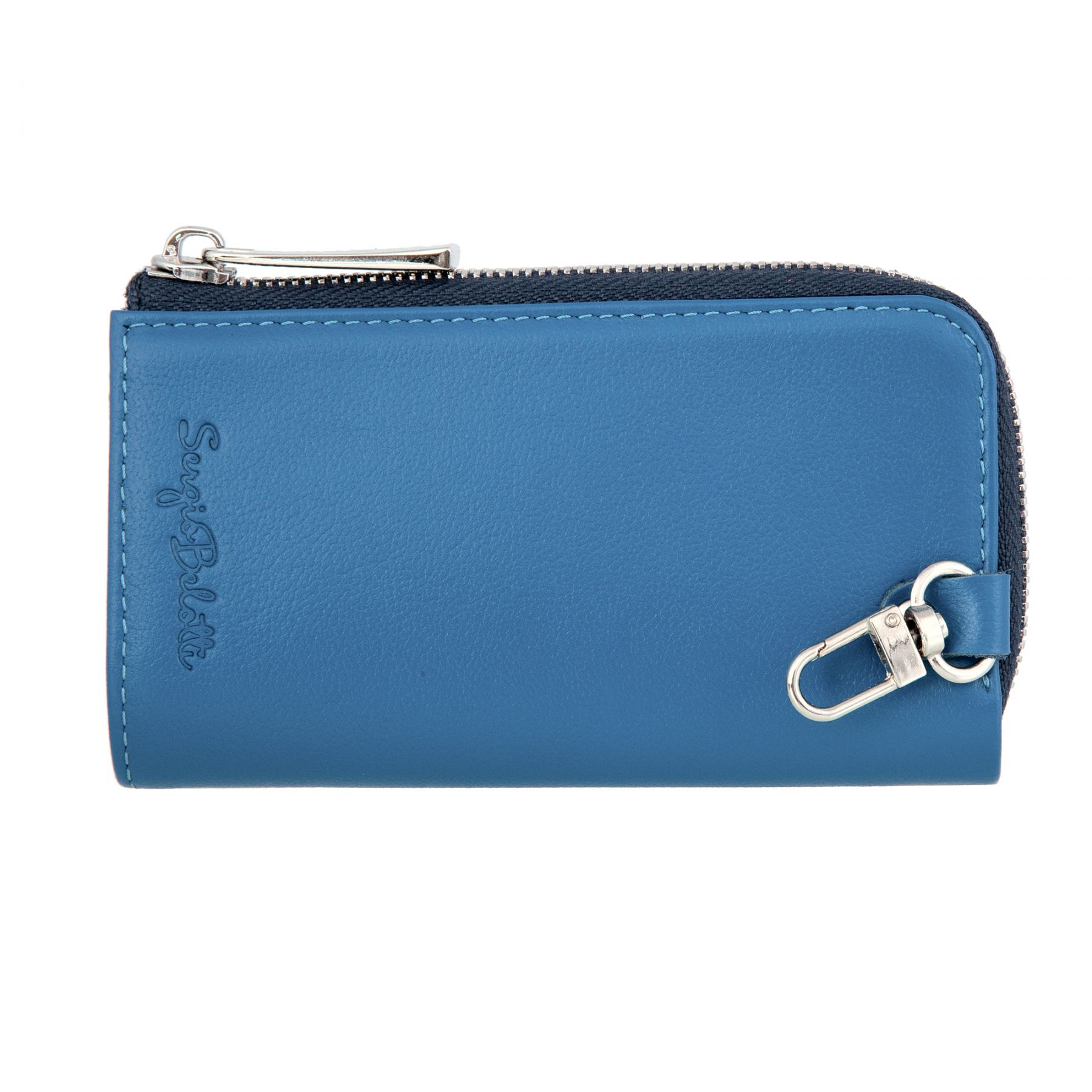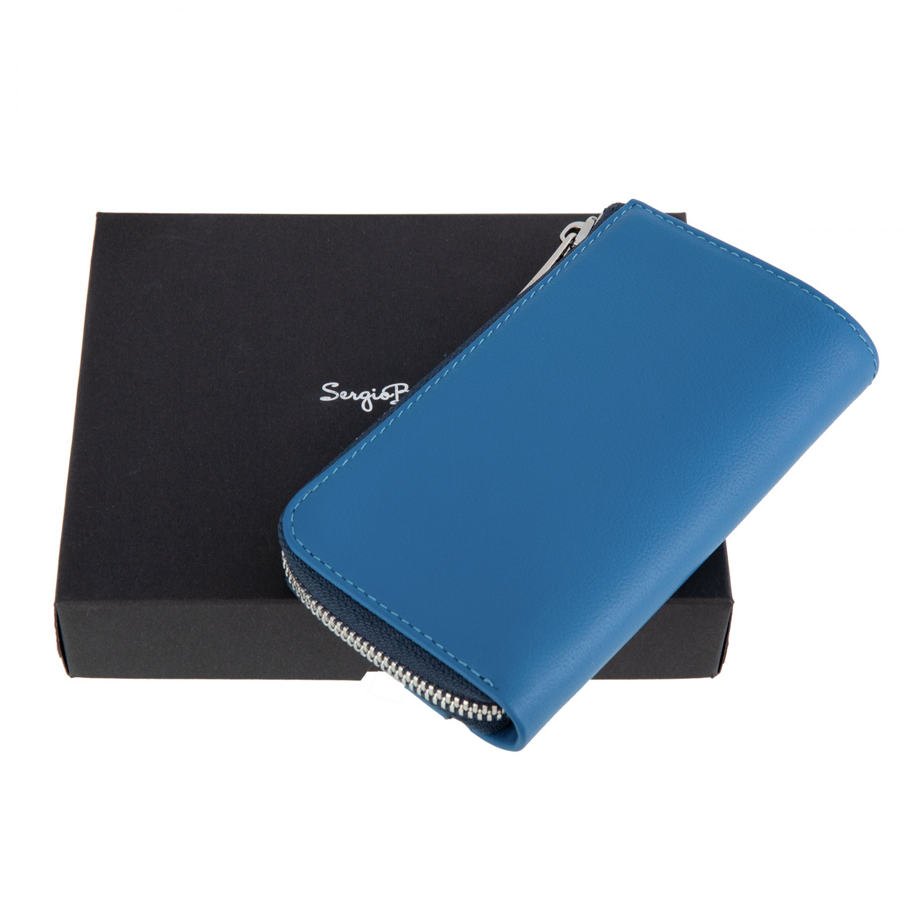 Ключница из натуральной кожи синего цвета естественной фактуры. Закрывается на молнию. Внутри отделение с кольцом для ключей, снаружи карабин для фиксации ключницы в сумке или на ремне. Товар упакован в подарочную коробку от бренда Sergio Belotti. Размеры: 14 х 8 х 2 см.
