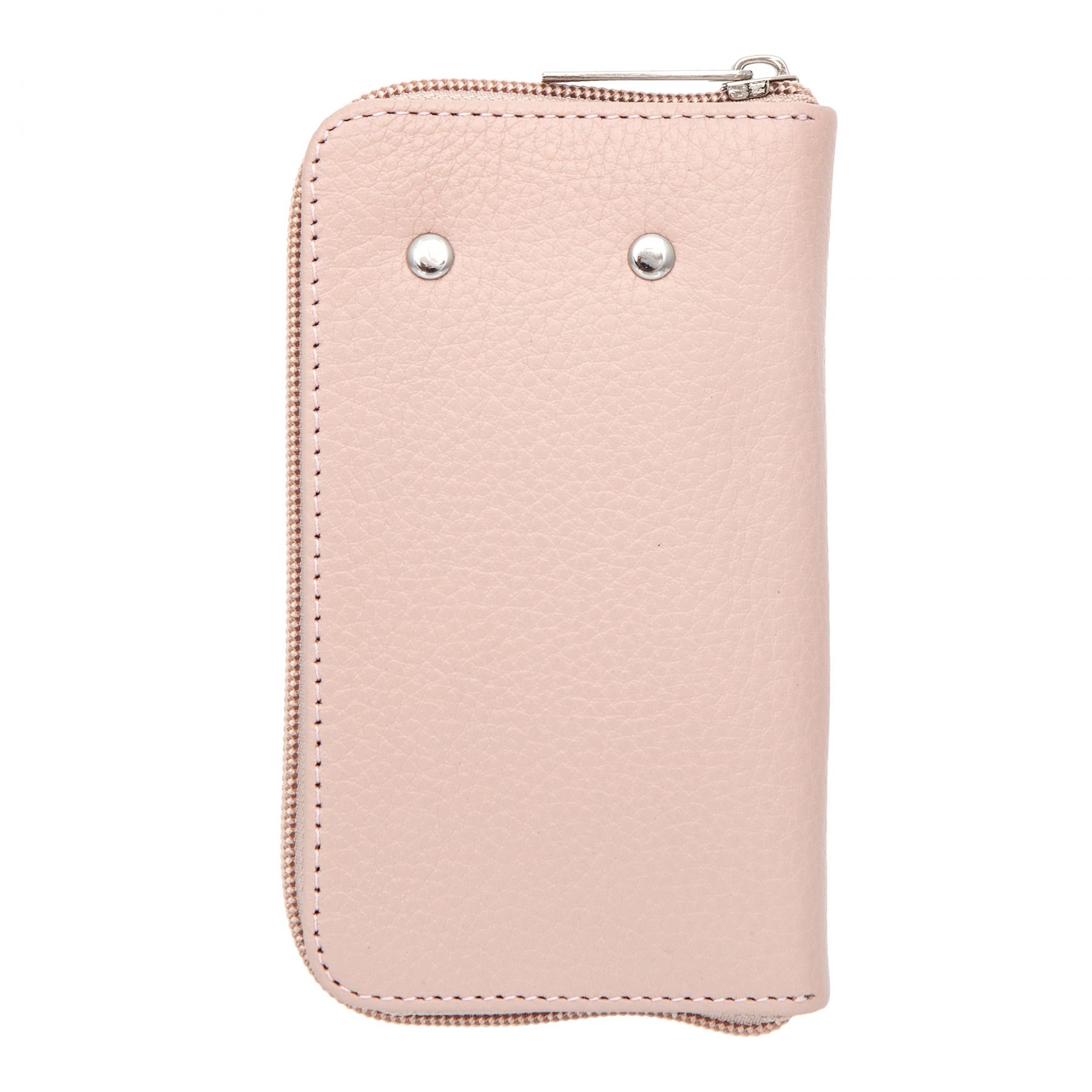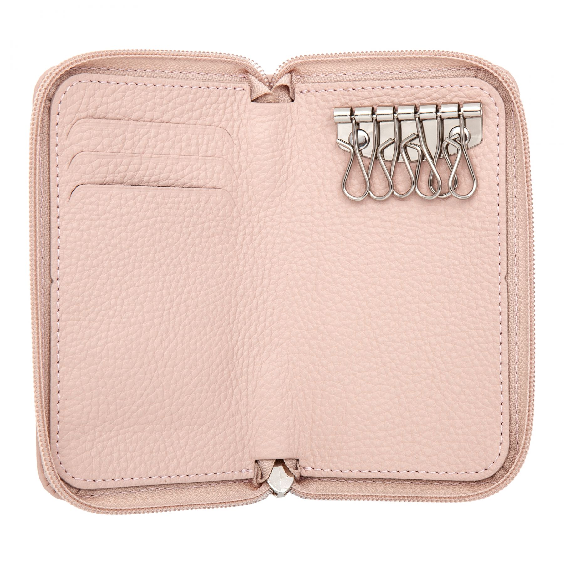 Розовая кожаная ключница от бренда Sergio Belotti. Закрывается на молнию. Внутри шесть карабинов для ключей и три кармашка для пластиковых карт. Товар упакован в подарочную коробку от бренда Sergio Belotti. Размеры: 13,5 х 8 х 2 см.