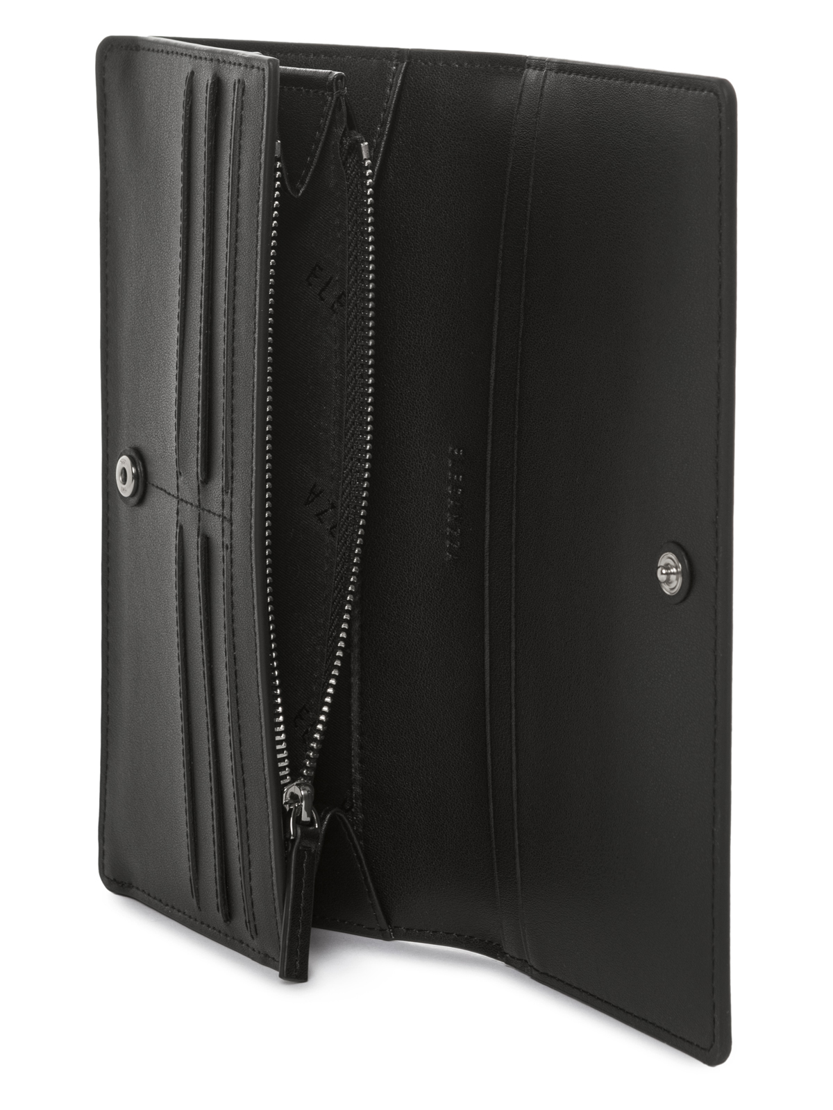 Женский кошелёк торговой марки Eleganzza из натуральной кожи. Модель закрывается на клапан с кнопкой и содержит внутри три открытых отделения одно отделение которое закрывается на металлическую молнию шесть отделений для кредитных и дисконтных карт.