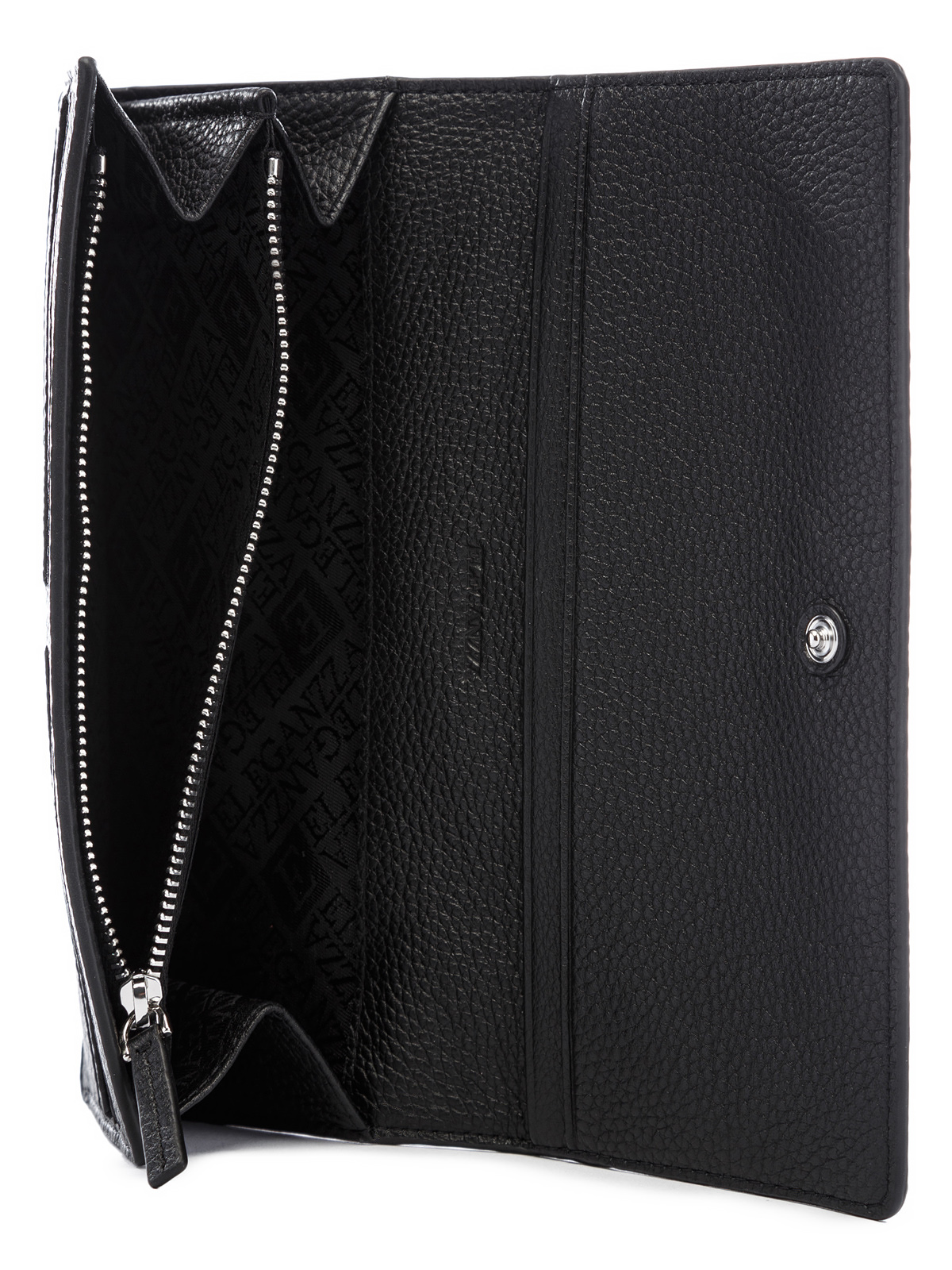 Женский кошелёк торговой марки Eleganzza из натуральной кожи. Модель закрывается на клапан с кнопкой и содержит внутри три открытых отделения одно отделение которое закрывается на металлическую молнию шесть отделений для кредитных и дисконтных карт.