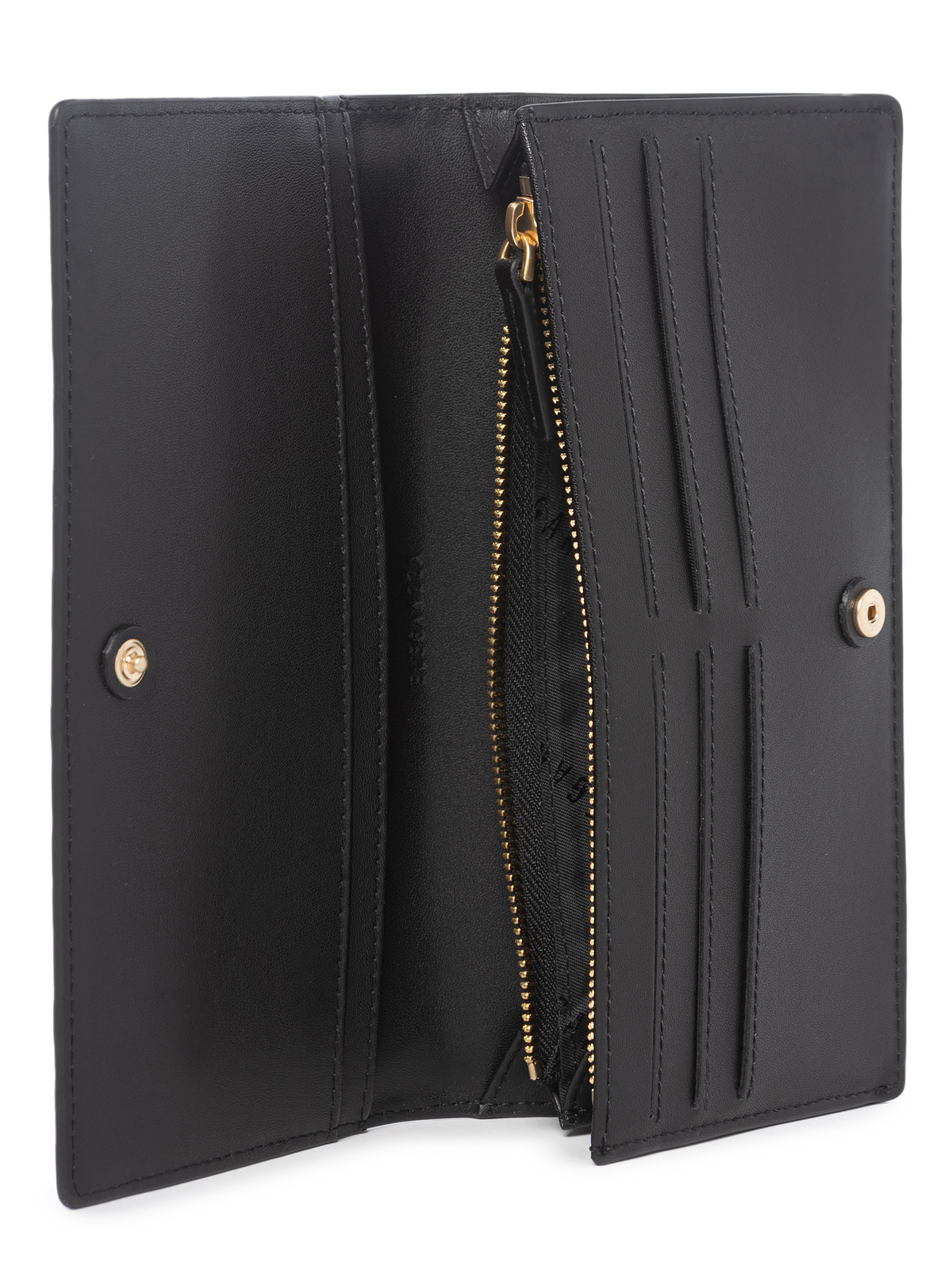Женский кошелёк торговой марки Eleganzza из натуральной кожи. Модель закрывается на клапан с кнопкой и содержит внутри три открытых отделения одно отделение которое закрывается на металлическую молнию шесть отделений для кредитных и дисконтных карт.