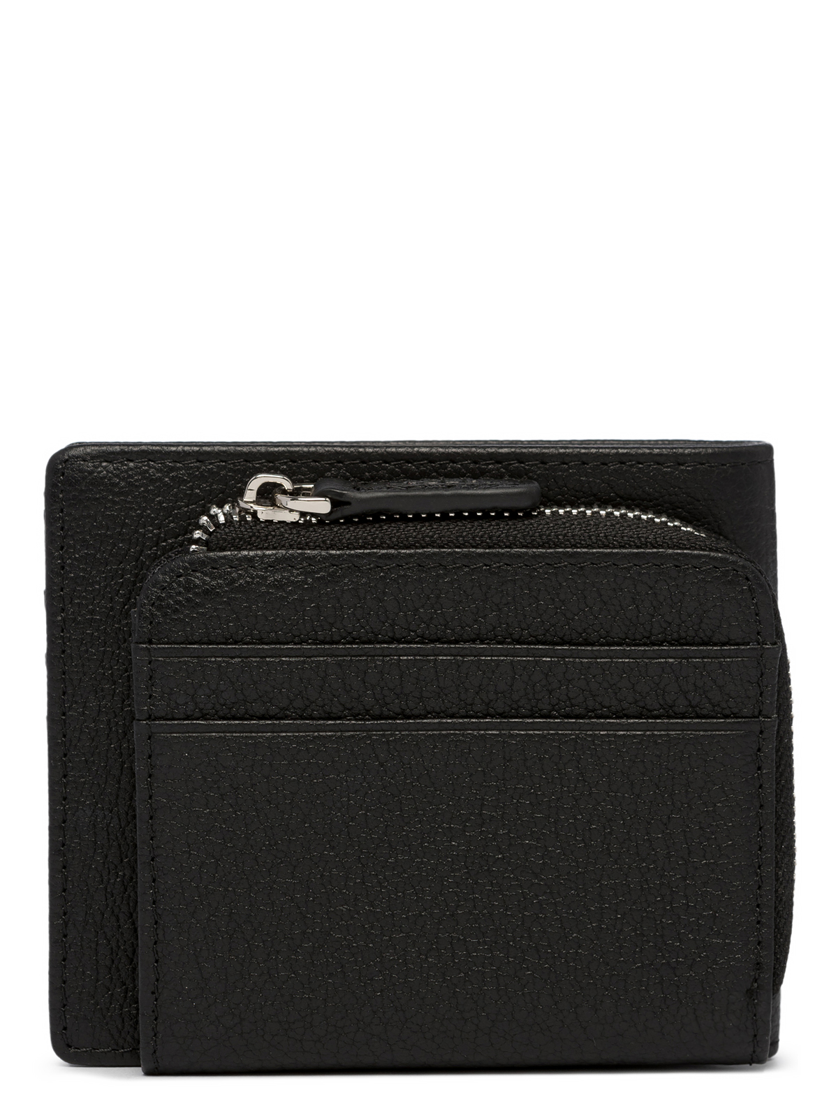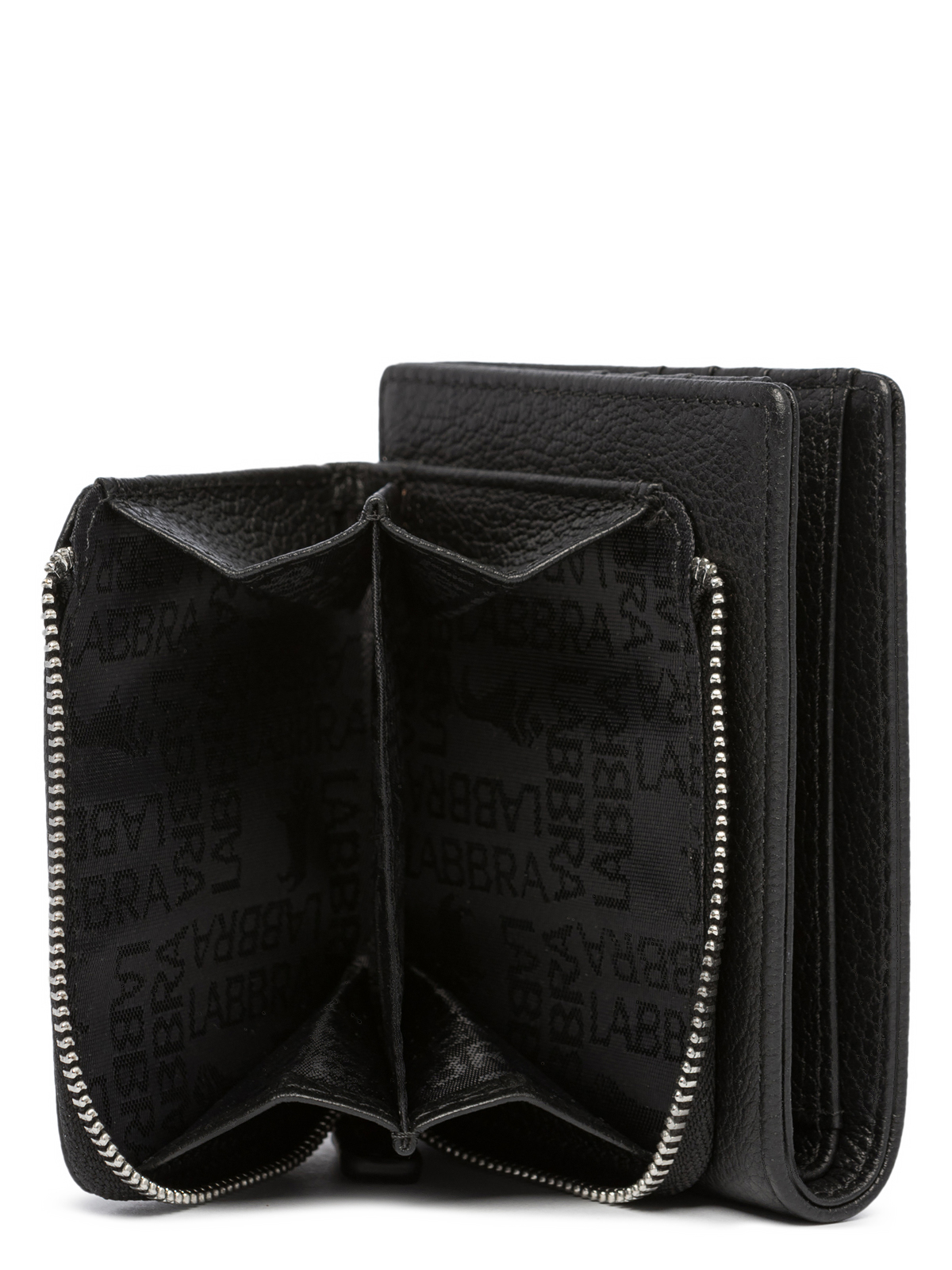 Женский кошелёк торговой марки LABBRA из натуральной кожи. Модель закрывается на кнопку. Содержит внутри два складывающихся отделения для купюр и шесть кармашков для банковских карт. Отделение для мелочи расположено снаружи и закрывается на молнию на нем есть два кармашка для банковских карт.