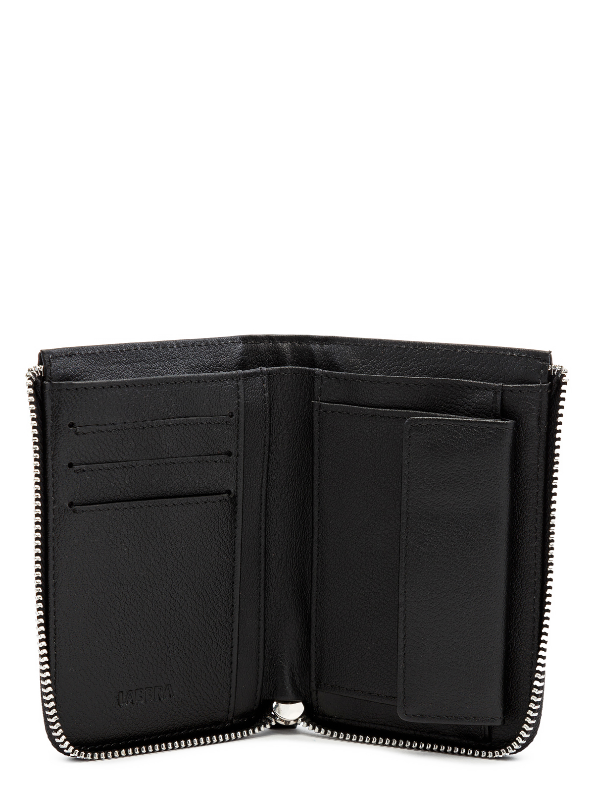 Женский кошелёк торговой марки LABBRA из натуральной кожи. Кошелек закрывается на металлическую молнию и содержит внутри открытое отделение для купюр дополнительное отделение на молнии. Шесть отделений для пластиковых карт и одно отделение для монет которое закрывается с помощью клапана на кнопке.
