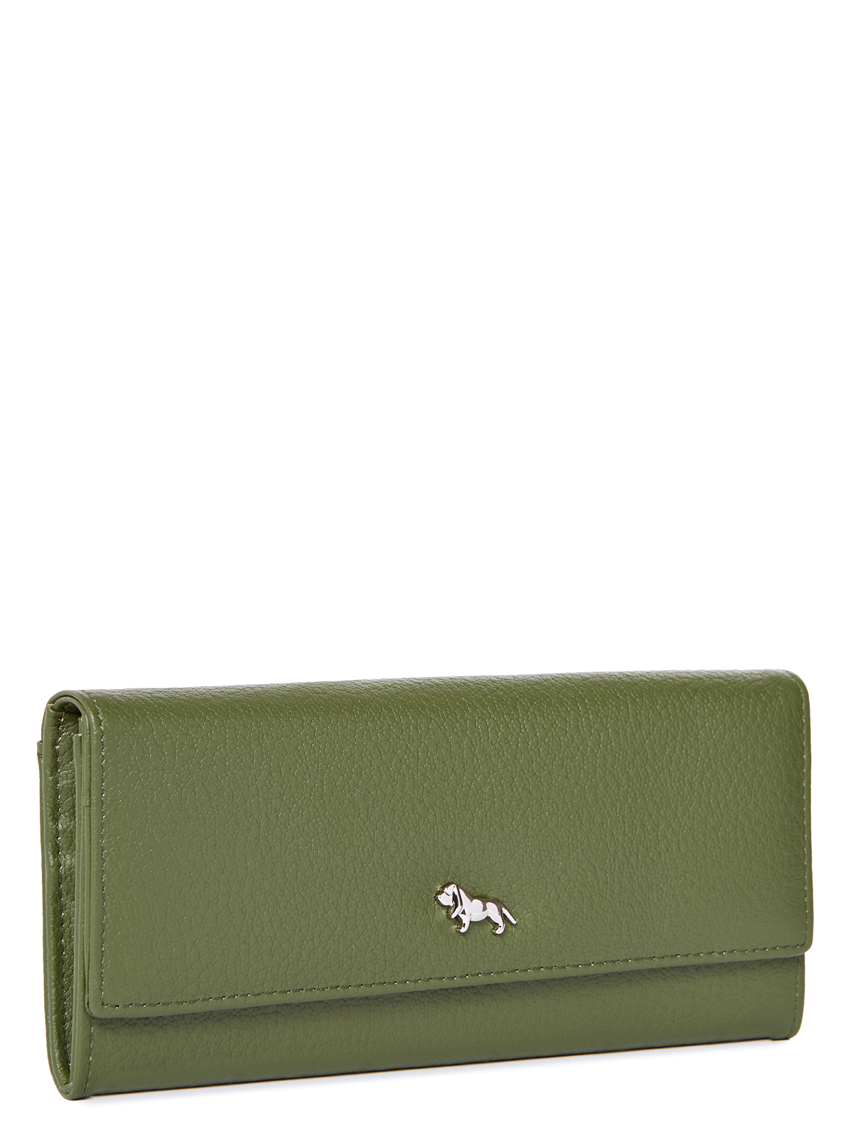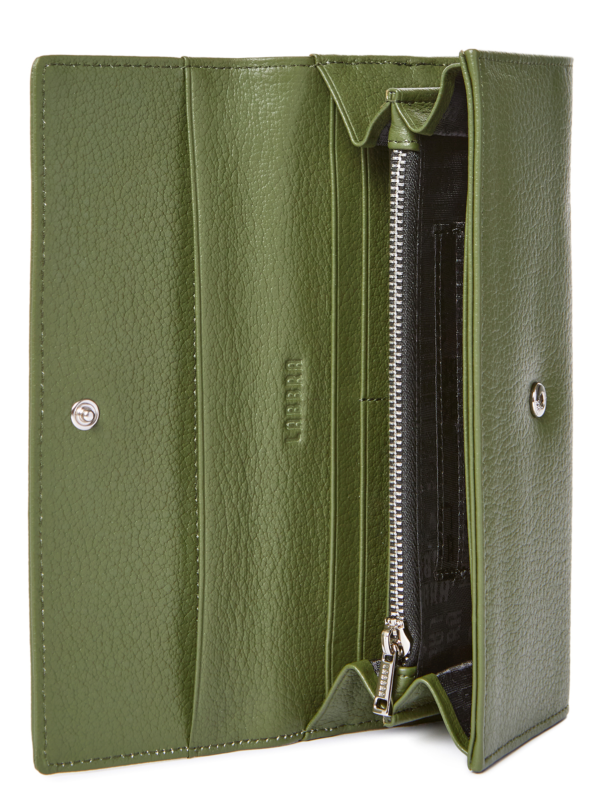 Женский кошелёк торговой марки LABBRA из натуральной кожи. Модель закрывается на клапан с кнопкой. Внутри кошелька есть 2 не складывающихся отделения для купюр и два дополнительных плоских кармана для купюр . отделение для мелочи которое закрывается на молнию 14 карманов для карт и один плоский складывающийся карман для документов. На задней стенке кошелька есть открытый плоский карман.