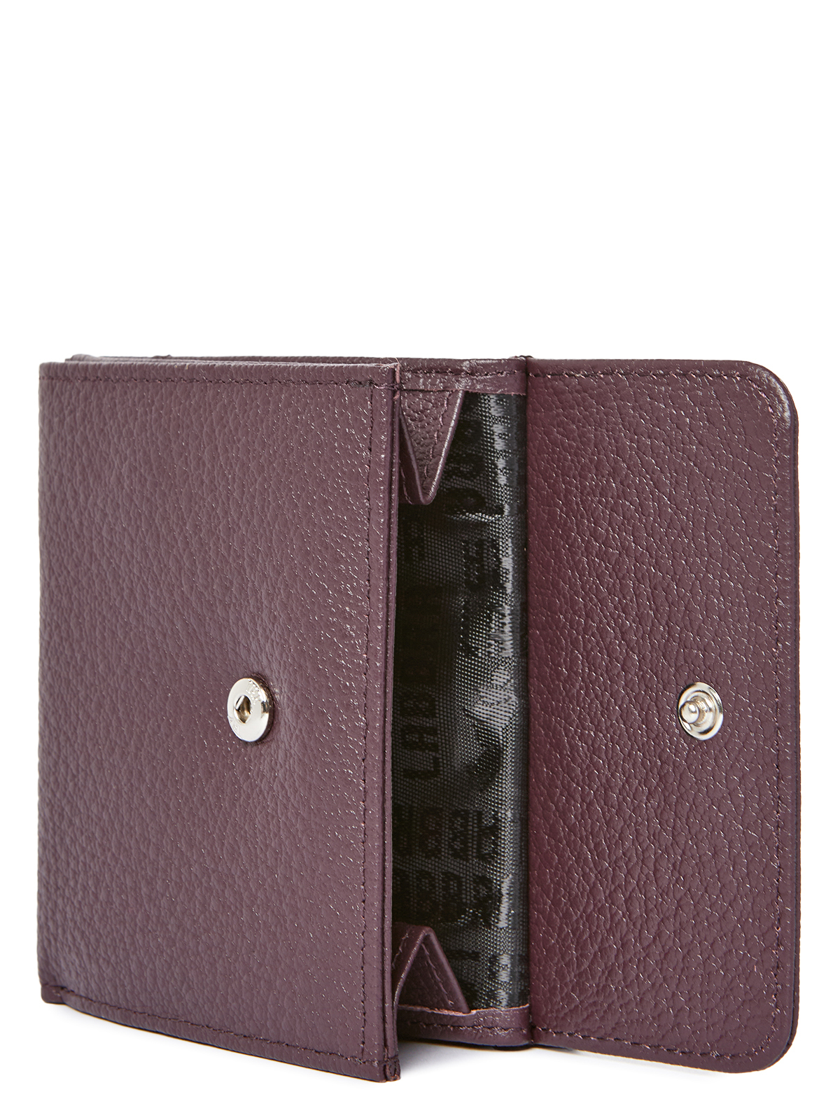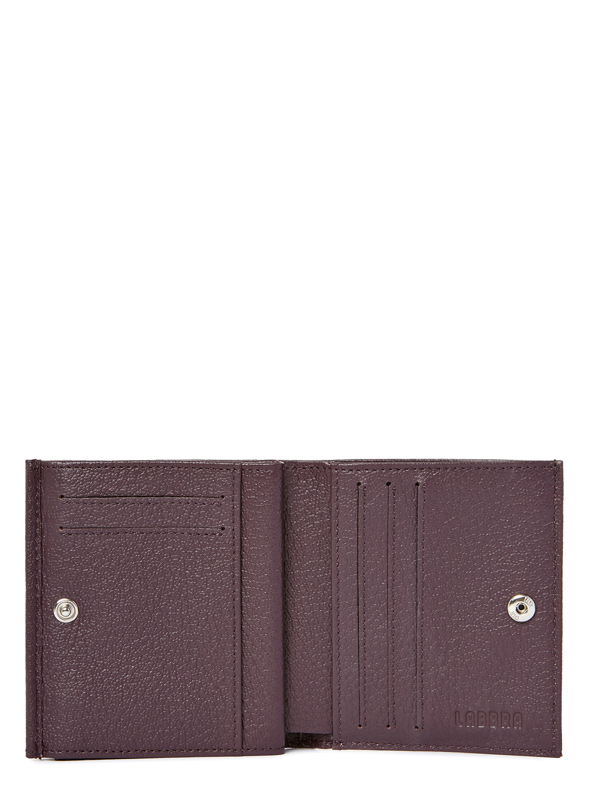 Женский кошелёк торговой марки LABBRA из нейлона. Основное отделение закрывается на кнопку. Внутри: два складывающихся отделения для купюр одно из которых закрывается на дополнительную пластиковую молнию; пять карманов для карточек и два дополнительных плоских кармана. Снаружи кошелька имеется отделение для мелочи которое закрывается клапаном с кнопкой.