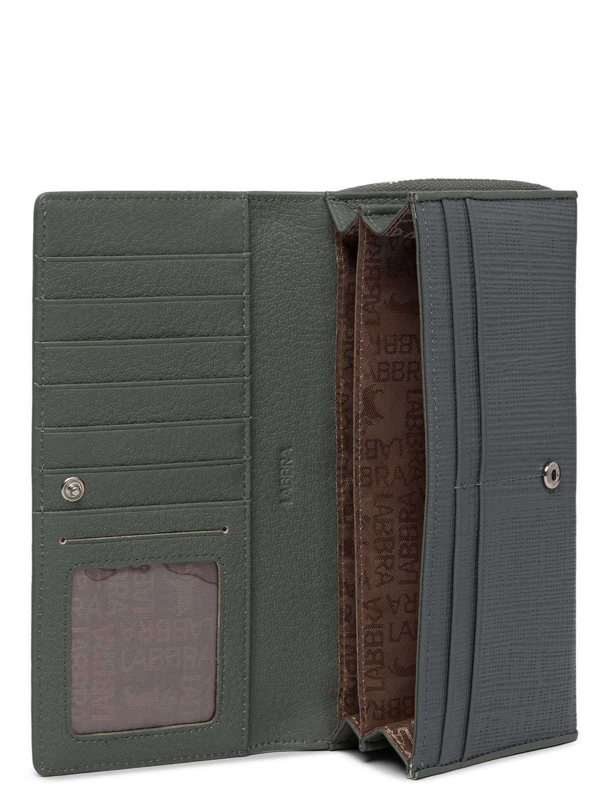 Кошелек торговый марки LABBRA из натуральной кожи. В кошельке два основных отделения. Одно отделение закрывается на полукруговую металлическую молнию и внутри имеет 2 отделения для купюр или мелочи и 4 дополнительных плоских кармана для карт. Второе основное отделение закрывается клапаном на кнопку и имеет 2 не складывающихся отделения и один дополнительный карман для купюр и 24 различных кармана для карт.