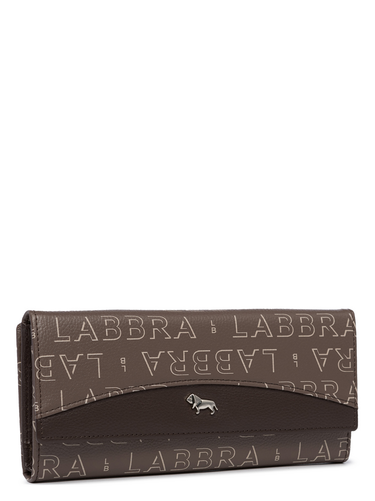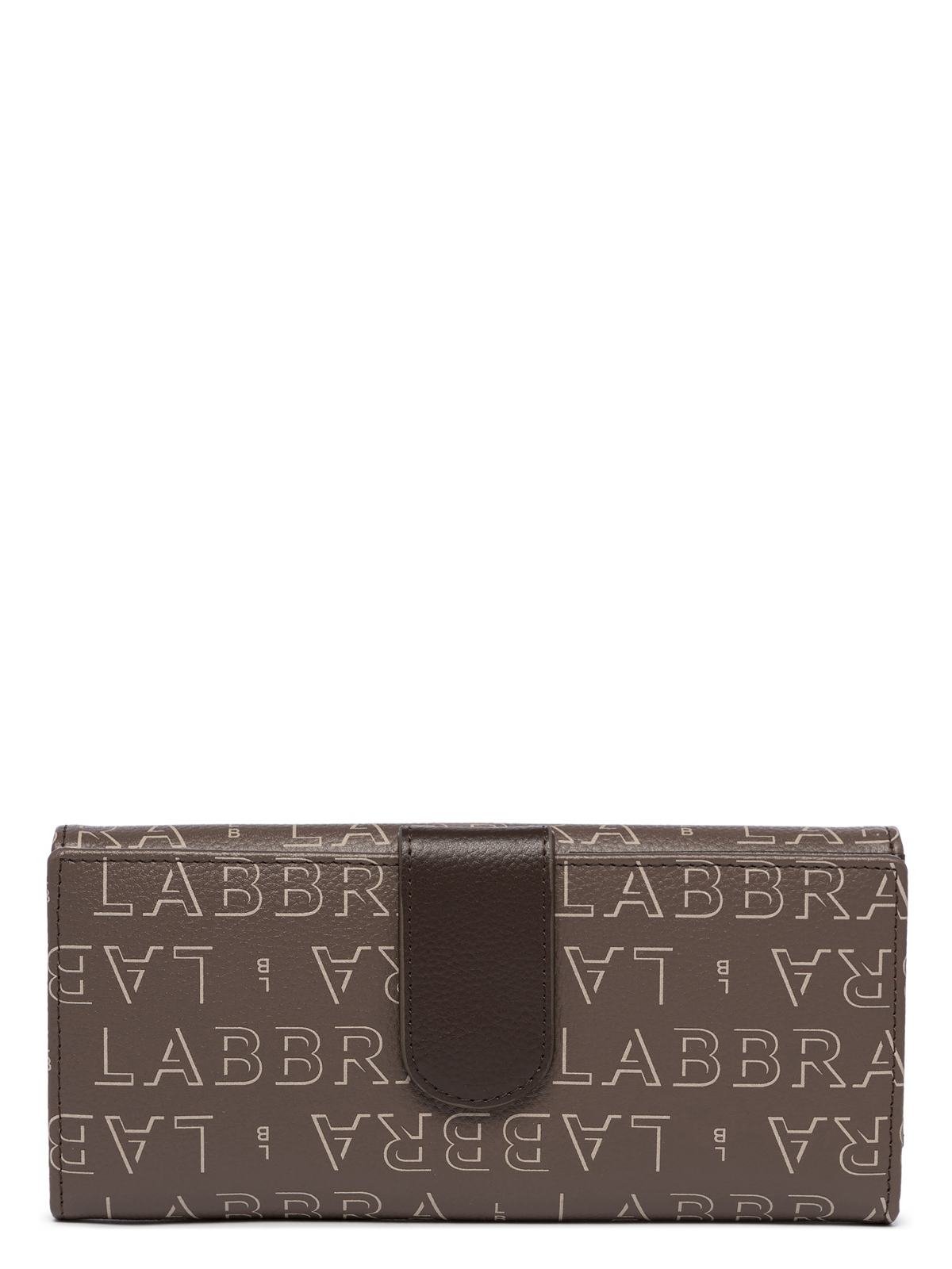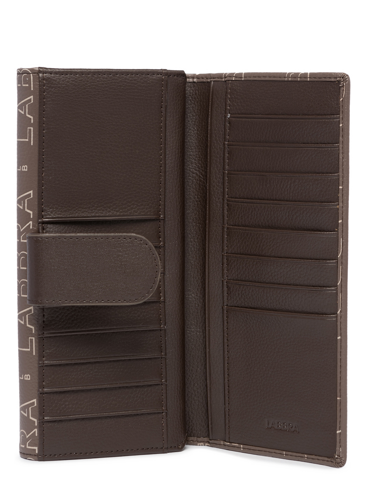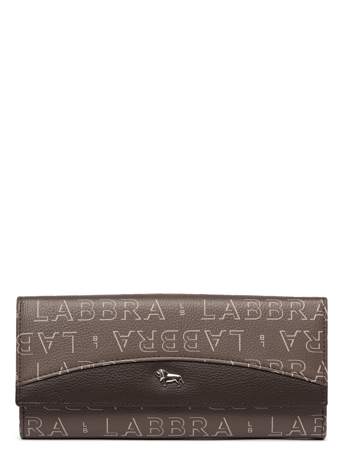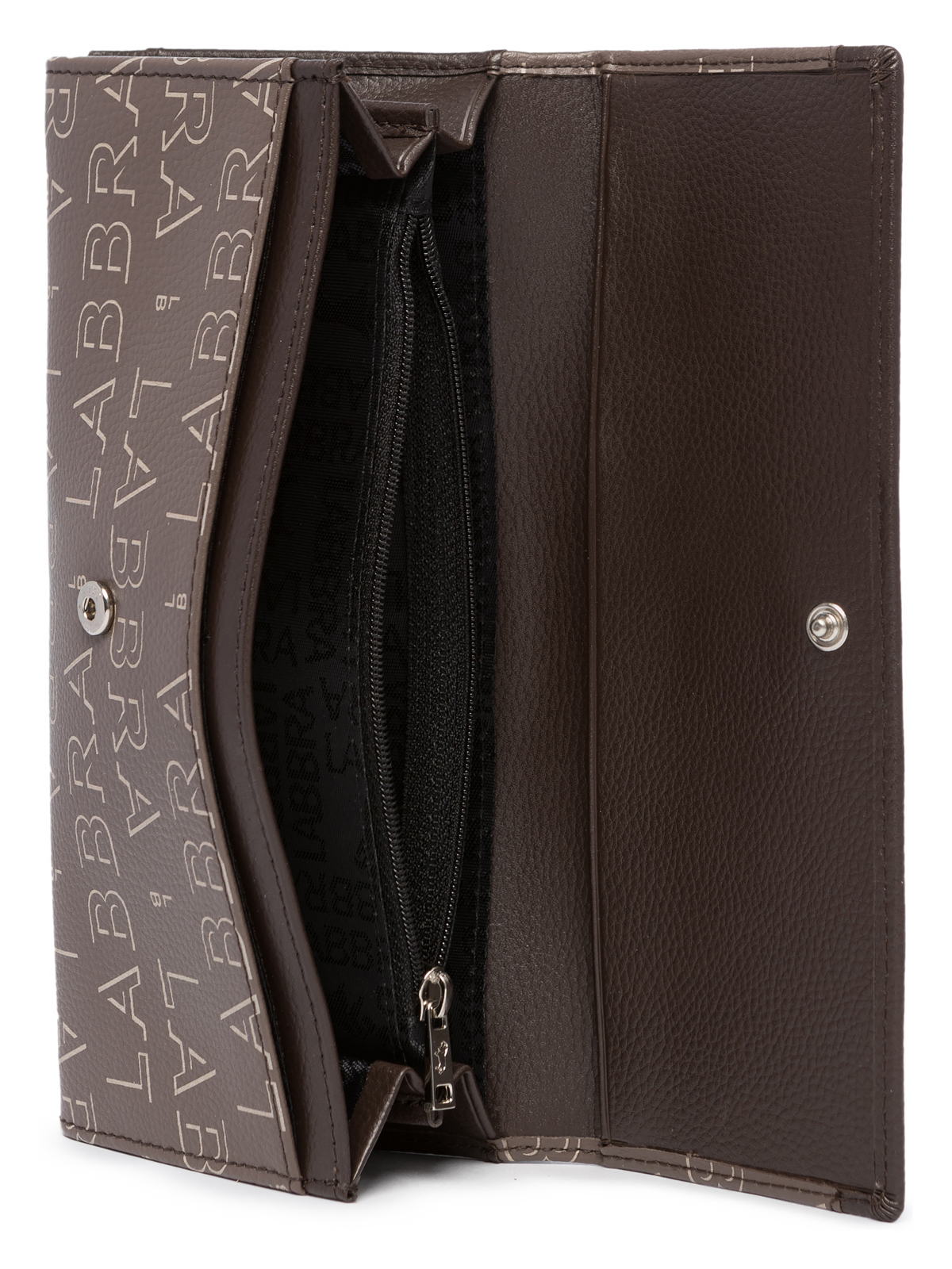 Кошелек торговый марки LABBRA из натуральной кожи. Модель имеет два основных отделения одно из которых закрывается на клапан с кнопкой и имеет 2 не складывающихся отделения и 3 дополнительных плоских кармана для купюр отделение для мелочи на дополнительной пластиковой молнии и 8 карманов для карт. Второе основное отделение -карточница закрывается на цупфер с кнопкой и имеет 20 различных карманов для карт и 2 плоских карманов для купюр.