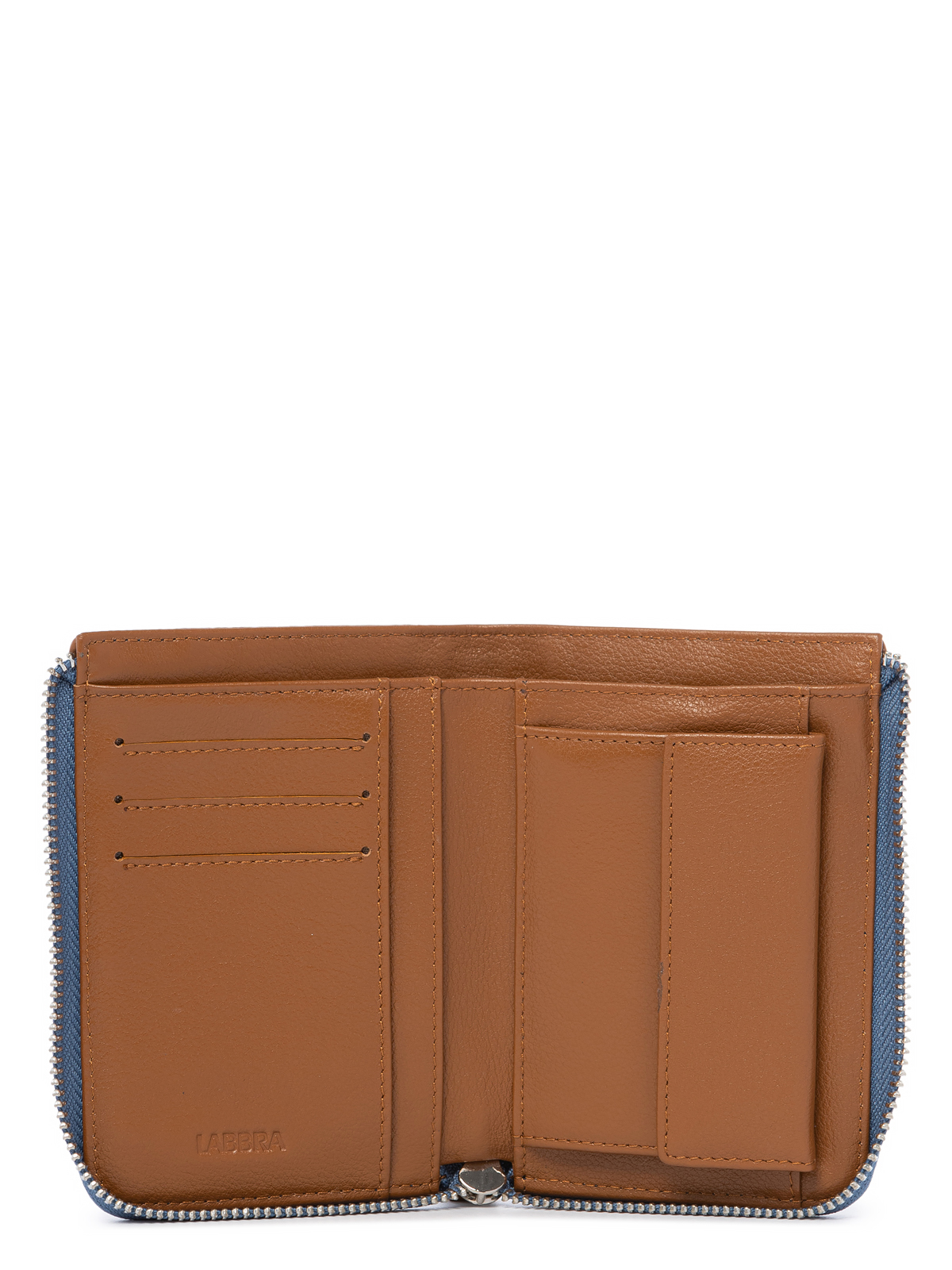 Женский кошелёк торговой марки LABBRA из хлопка. Кошелек закрывается на металлическую молнию и содержит внутри открытое отделение для купюр дополнительное отделение на молнии. Шесть отделений для пластиковых карт и одно отделение для монет которое закрывается с помощью клапана на кнопке.