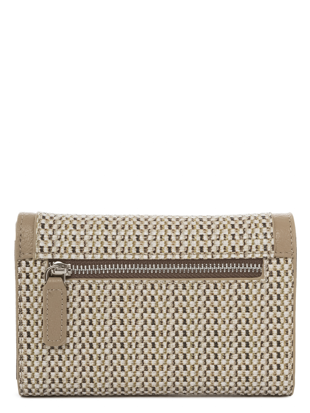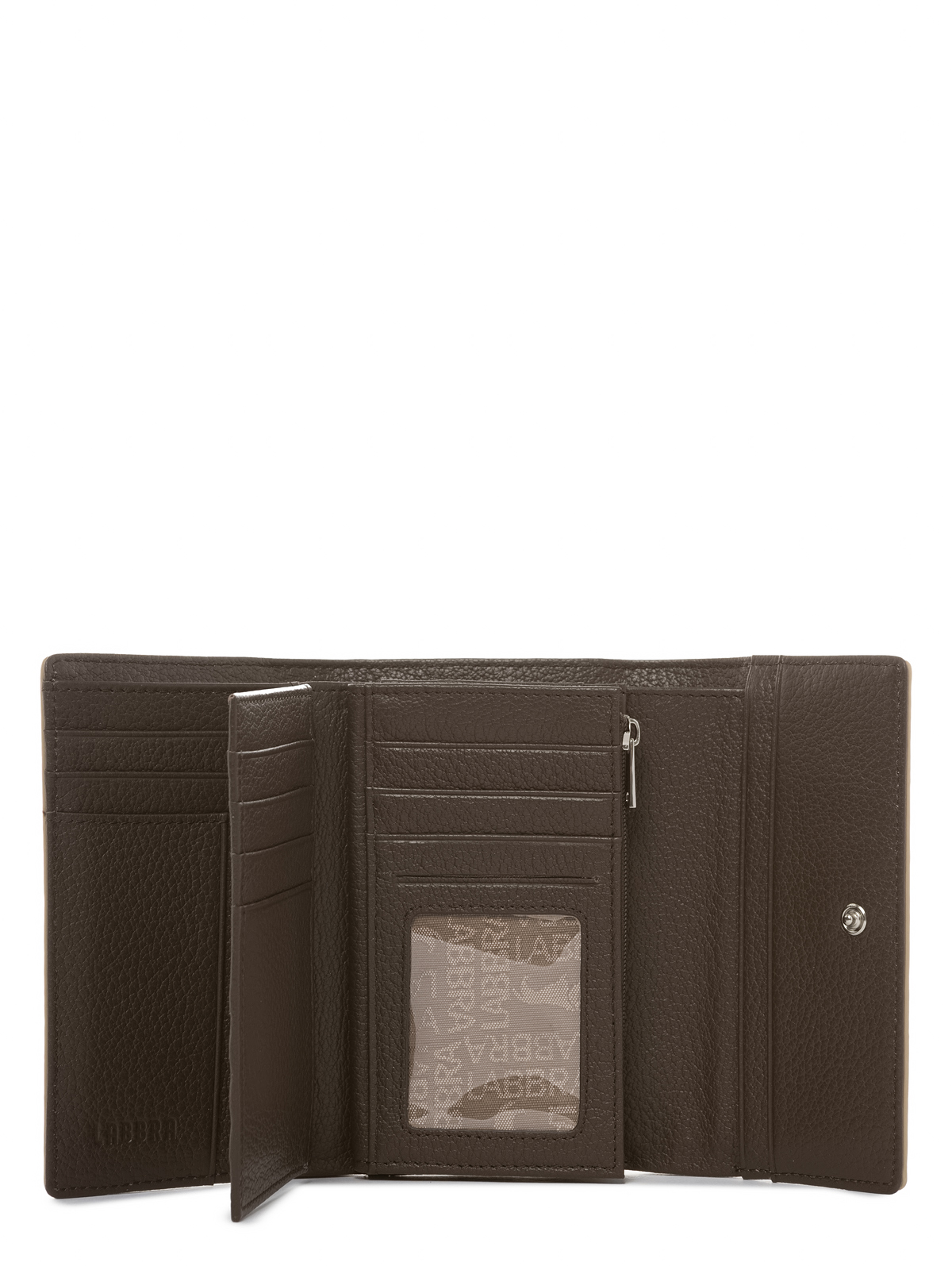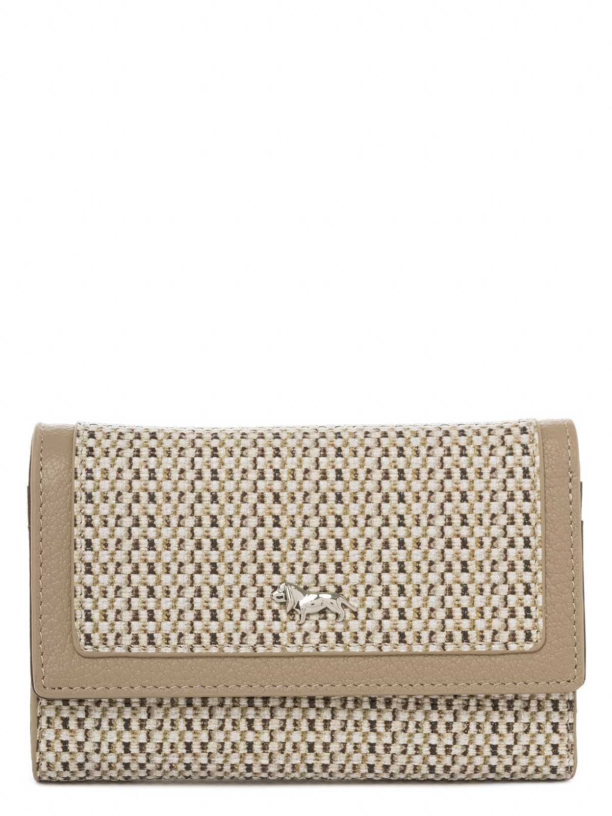 Женский кошелёк торговой марки LABBRA из натуральной кожи. Принт изделия отражает мировой тренд на натуральность и природные мотивы. Он нанесен на лицевую сторону натуральной кожи с использованием сеточной технологии создавая эффект ткани из натурального льна. Тиснение подчеркивает текстуру усиливая реалистичность рисунка. Модель закрывается клапаном на кнопку. В кошельке есть 2 складывающееся отделения для купюр одно из которых закрывается на пластиковую молнию 17 карманов для кредитных и дисконтных карт 6 дополнительных различных плоских открытых кармана 2 кармана для мелочи - внутри и снаружи оба закрываются на молнию и имеют по одному отделению.