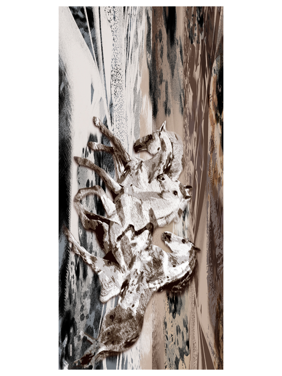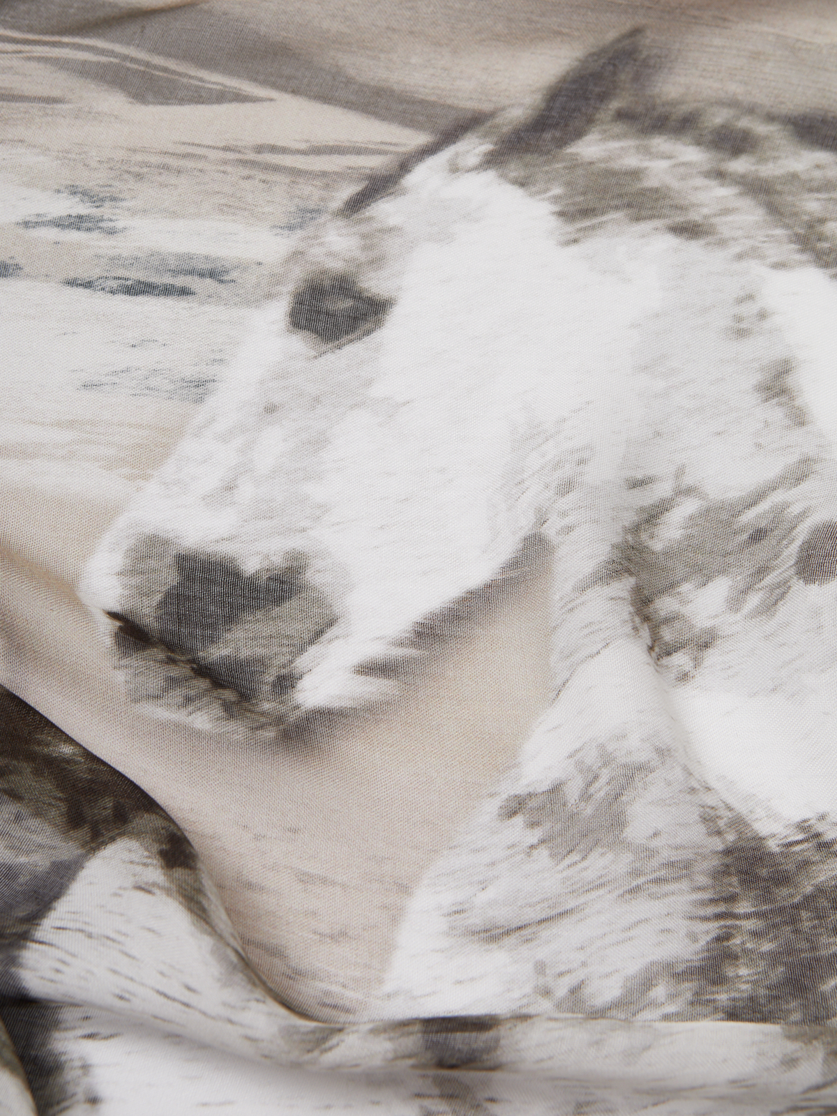 Палантин женский торговой марки ELEGANZZA выполненный из смесового материала и дополненный динамичным принтом с изображением летящей тройки лошадей наполненных духом свободы. Края обработаны фабричной закрепкой.