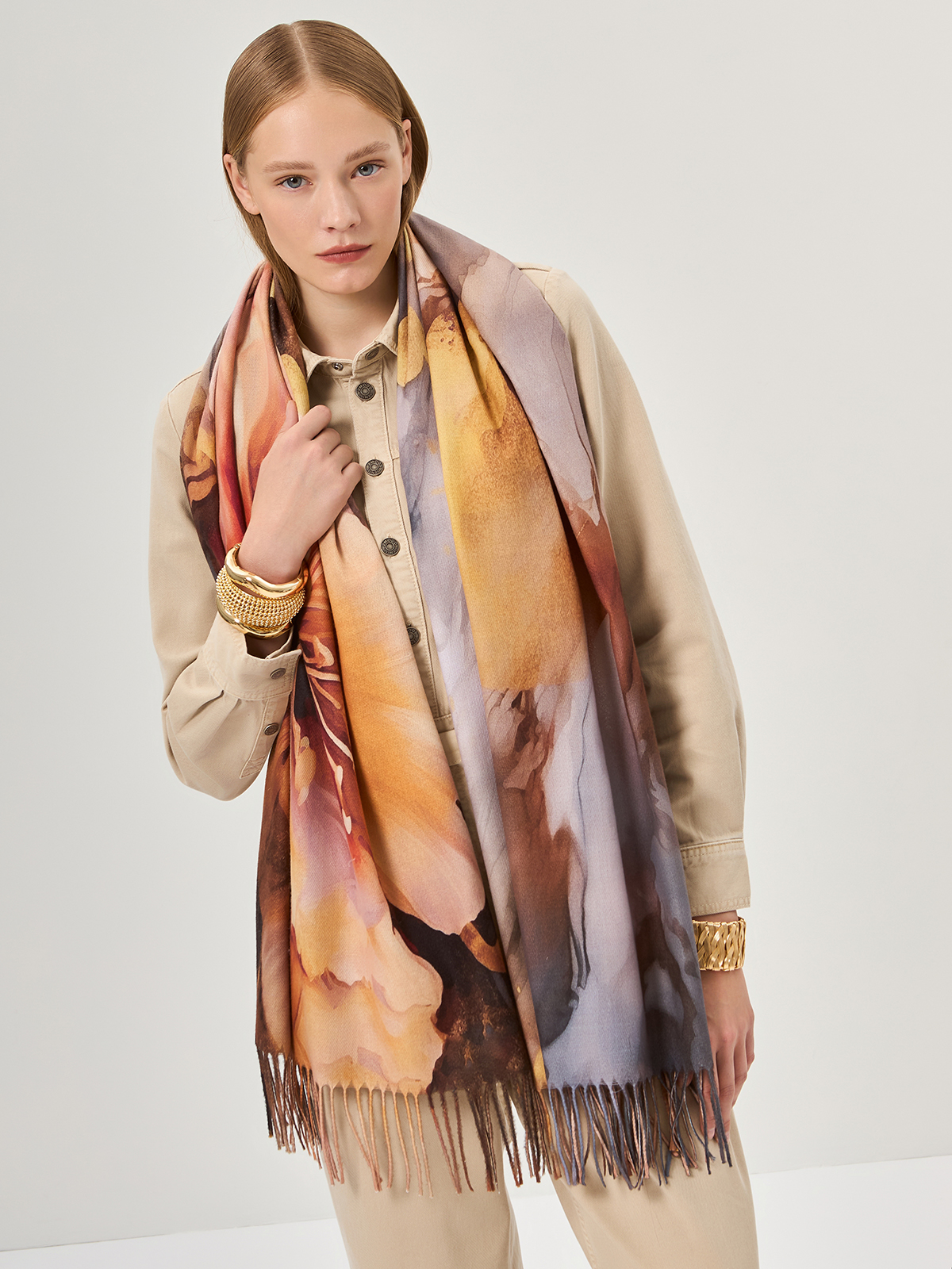 Палантин женский торговой марки Labbra выполненный из вискозы с добавлением мягкой шерсти. Изделие выполнено с применением уникальной технологии двусторонней печати double face". На одной стороне палантина деликатный градиент на другой - контрастный однотонный цвет. Края обработаны фабричной закрепкой с кисточками."