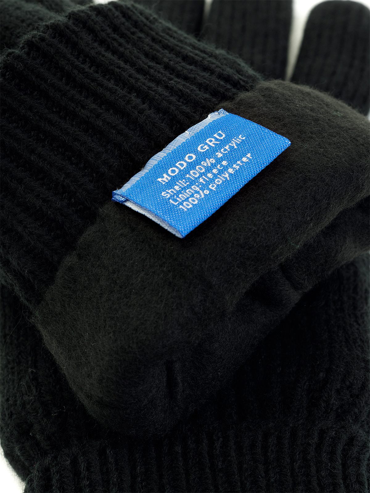 Перчатки тороговой марки MODO изготовлены из 100% акрила. Подкладка: флис. Длина манжеты от нижней точки большого пальца до края перчатки - 11 см (трикотажную манжету можно отвернуть). Длина пальцев - средняя.