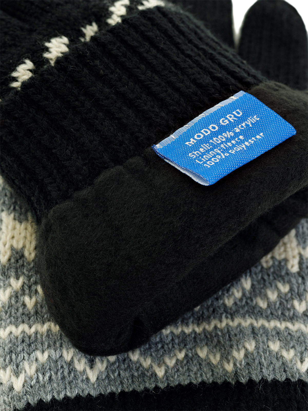 Перчатки тороговой марки MODO изготовлены из 100% акрила. Подкладка - флис. Длина манжеты от нижней точки большого пальца до края перчатки - 13 см. Длина пальцев - средняя.