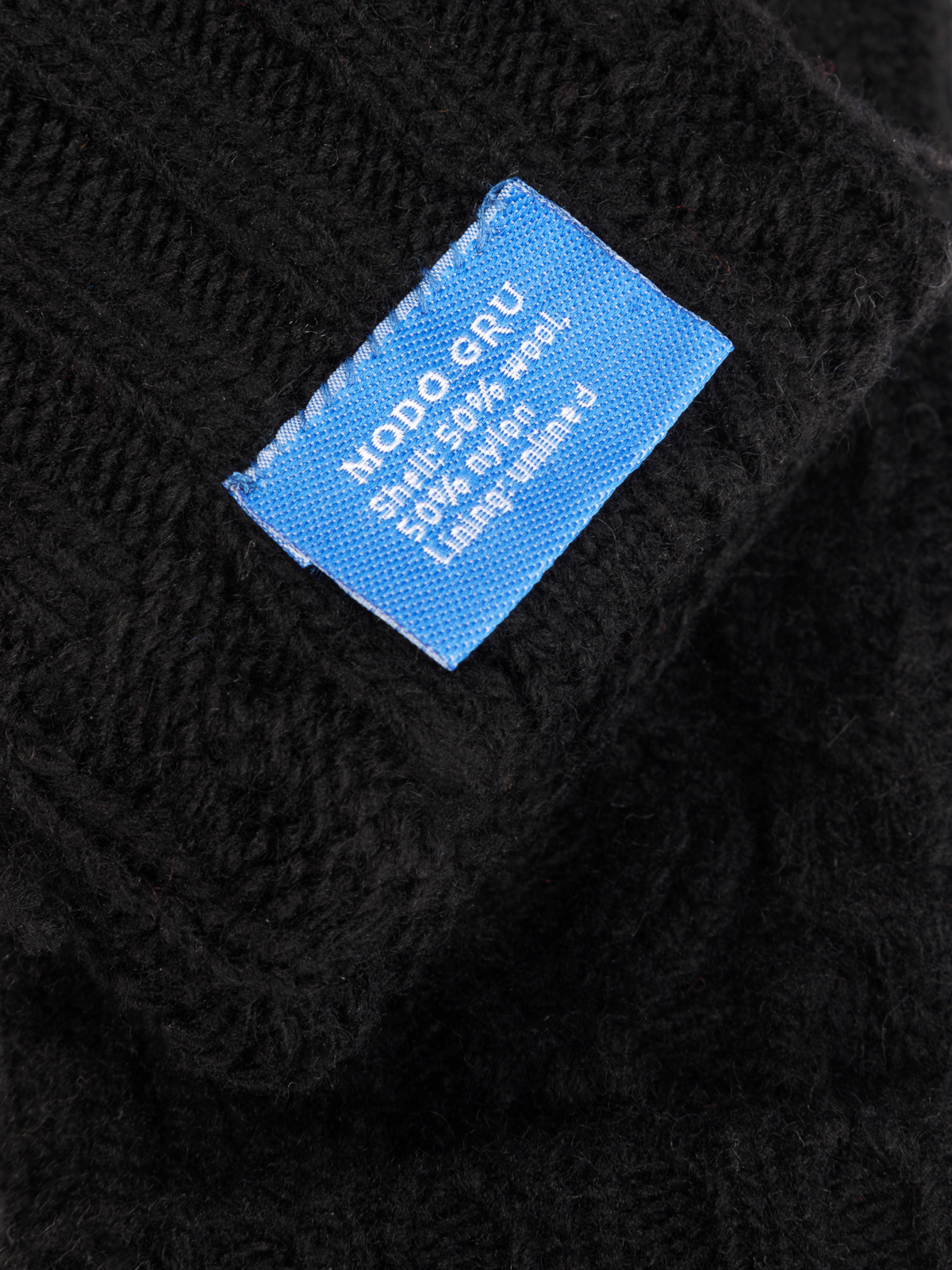 Перчатки торговой марки MODO производства Китай выполнены из текстильной шерсти. Состав материала верха: 50% шерсть 50% нейлон. Без подкладки. Декоративные элементы - фигурное вязание на лицевой части орнамент из кос. Длина манжеты от нижней точки большого пальца до края перчаток - 10 см. Длина пальцев - средняя. Модель без размера подходит на любую полноту руки от размера XS до L