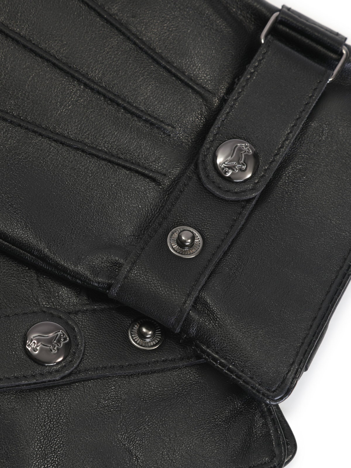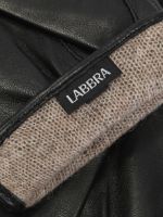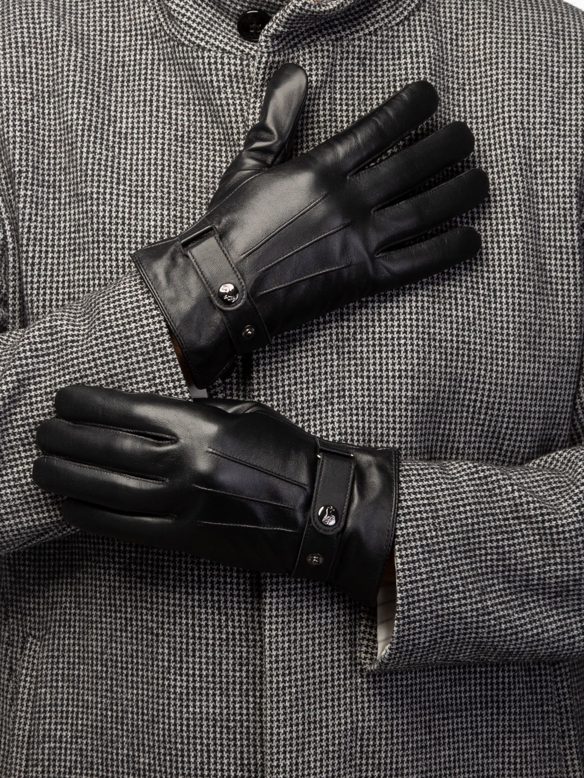 Перчатки торговой марки LABBRA производства Китай изготовлены из натуральной кожи ягненка черного цвета. Подкладка: 70% шерсть 30% акрил. Декоративные швы три луча" на лицевой стороне. На манжете ремень на кнопке регулирующий ширину. На ладонной стороне резинка. Длина манжеты от нижней точки большого пальца до края перчаток составляет - 5 см. Пальцы средние."