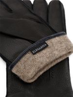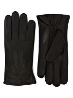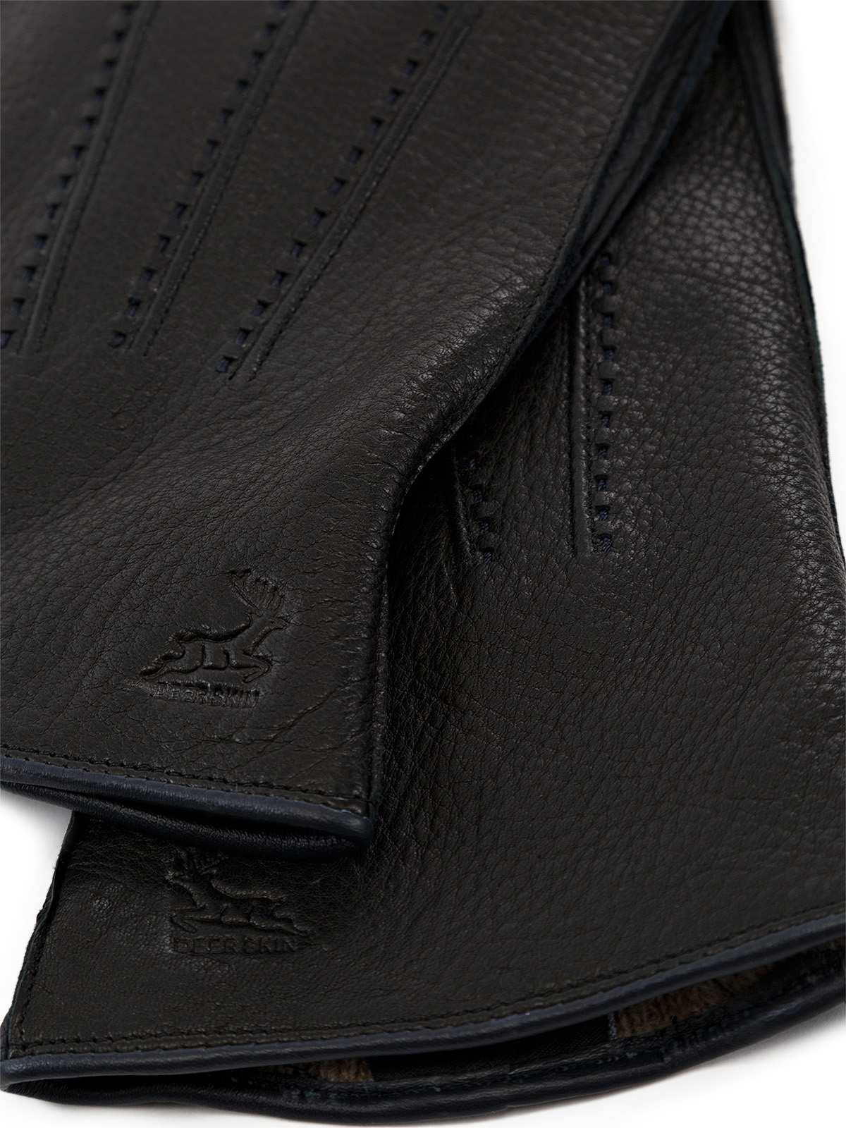 Перчатки торговой марки ELEGANZZA производства Китай выполнены из кожи оленя черного цвета. Отделка - декоративные швы три луча" вставки из кожи темно-синего цвета между пальцев и вдоль боковых швов. Подкладка: 100% шерсть. Швы - наружные ручные. На ладонной стороне резинка. Длина манжеты от нижней точки большого пальца до края перчаток - 5 см. Длина пальцев - средняя."