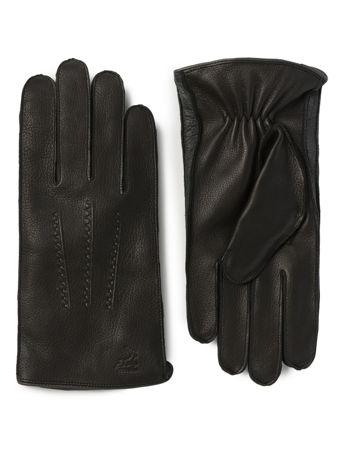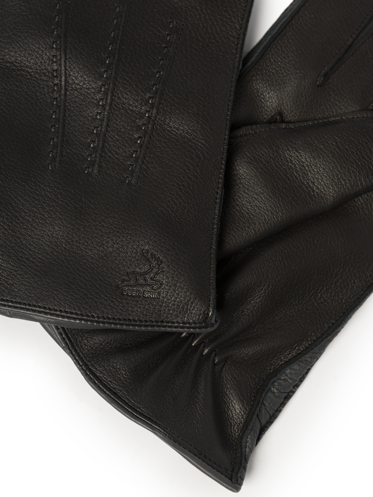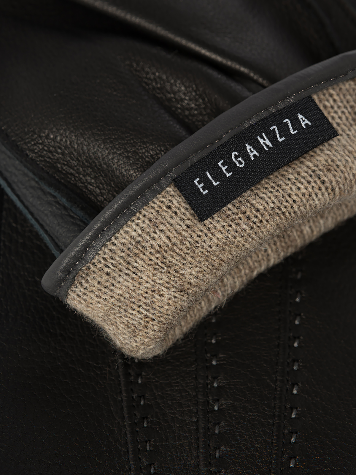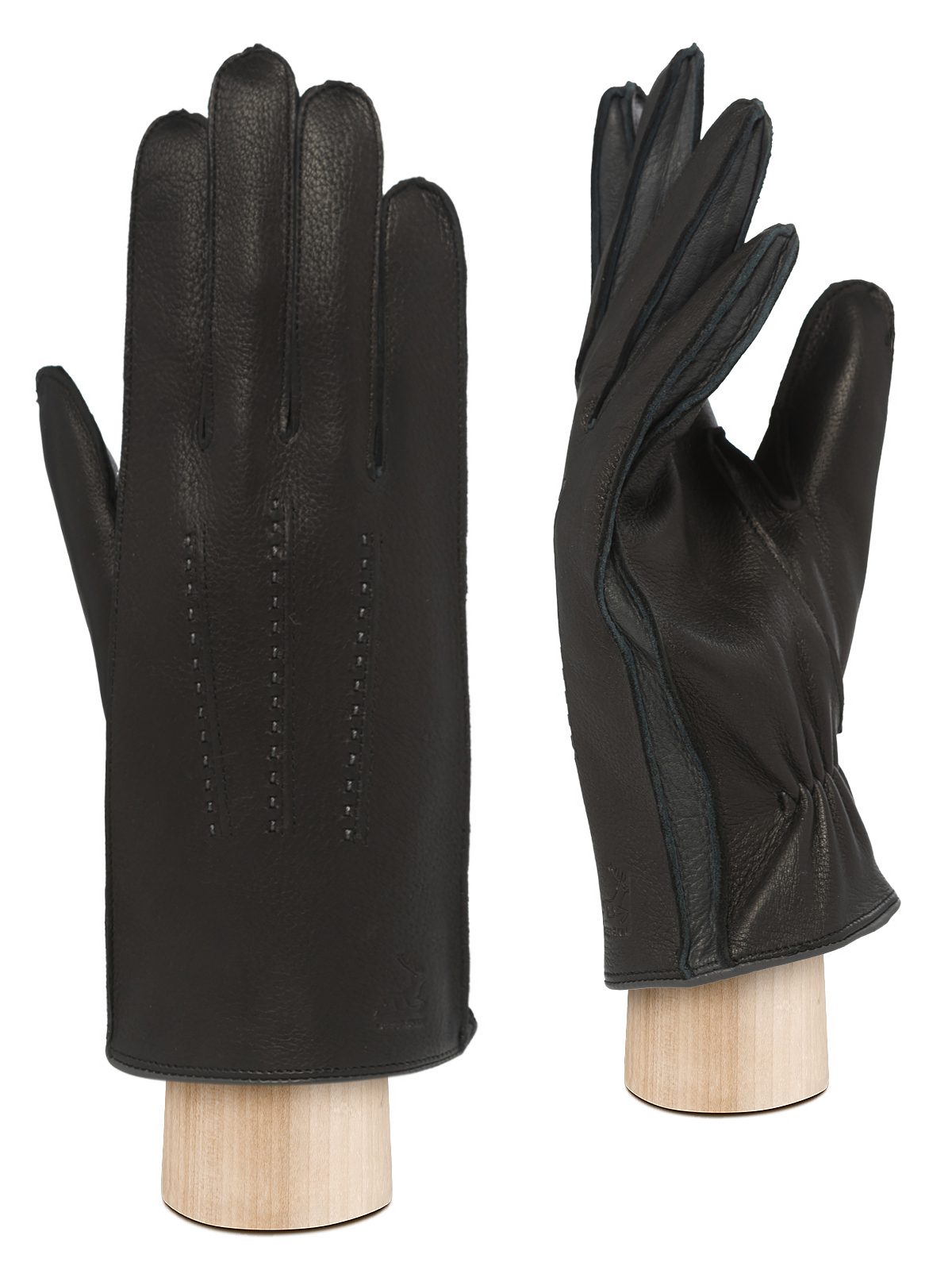 Перчатки торговой марки ELEGANZZA производства Китай выполнены из кожи оленя черного цвета. Отделка - декоративные швы три луча" вставки из кожи темно-серого цвета между пальцев и вдоль боковых швов. Подкладка: 100% шерсть. Швы - наружные ручные. На ладонной стороне резинка. Длина манжеты от нижней точки большого пальца до края перчаток - 5 см. Длина пальцев - средняя."