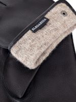 Перчатки торговой марки ELEGANZZA производства Китай выполнены из кожи оленя черного цвета. Подкладка 100% шерсть. Отделка: декоративный ремень по боковому разрезу на кнопке с фирменной символикой. Модель с наружними машинными швами. Длина манжеты от нижней точки большого пальца до края перчаток - 4 см. Длина пальцев - средние.