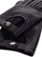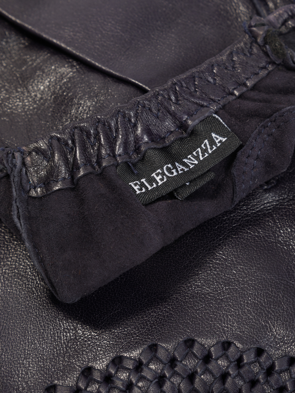 Перчатки торговой марки ELEGANZZA производства Китай выполнены из натуральной кожи ягненка. Отделка - перфорация на лицевой стороне с продежками тонким кожаным шкурком выполненные в ручную. Декоративный вырез на лицевой стороне закрепляется ременём на кнопке с фирменной символикой. Без подкладки. Длина манжеты от нижней точки большого пальца до края перчаток - 35 см. На ладонной стороне по низу манжеты - резинка. Длина пальцев - средняя.