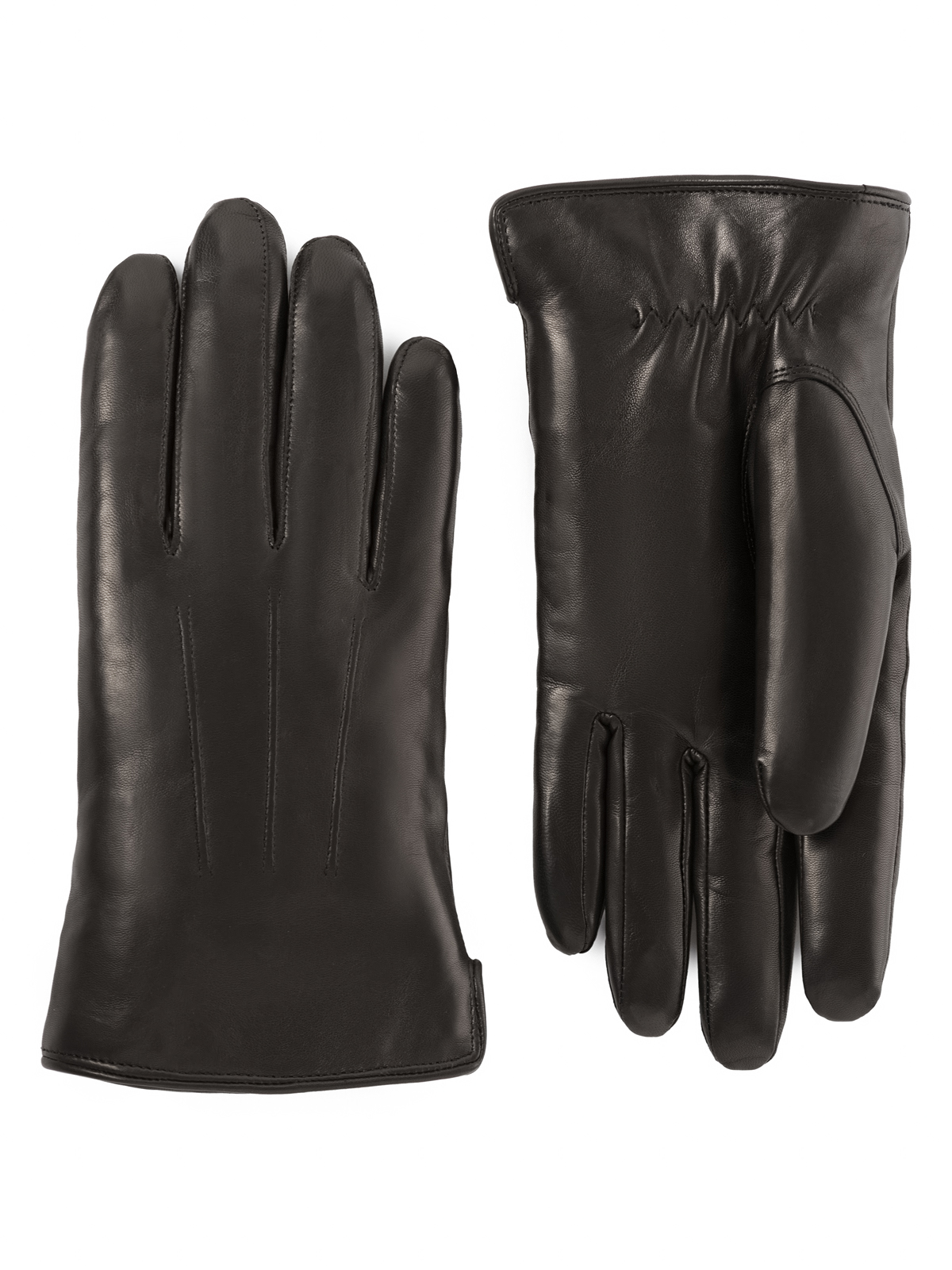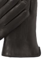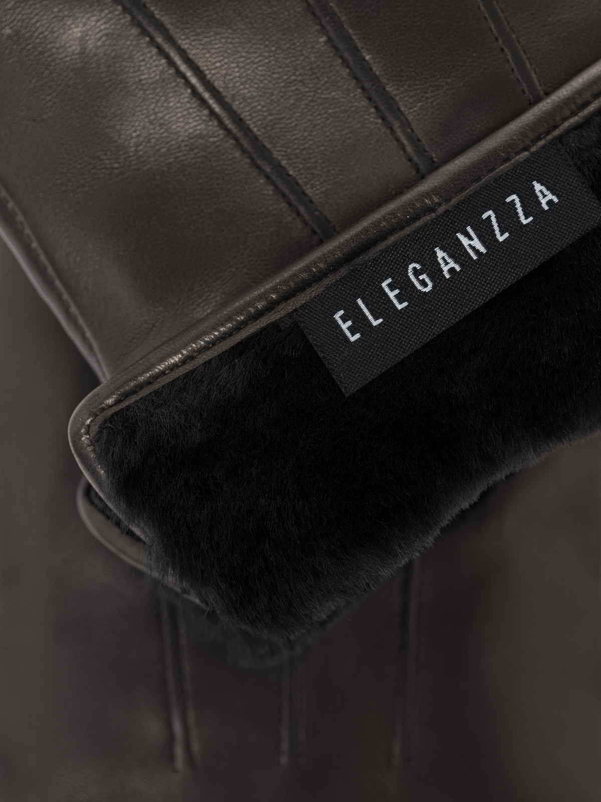 Перчатки торговой марки ELEGANZZA производства Китай изготовлены из натуральной кожи черного цвета. Подкладка - мех (мутон). Отделка - декоративные швы три луча". Длина манжета от нижней точки большого пальца до края перчатки составляет 5 см. Длина пальцев - средняя."