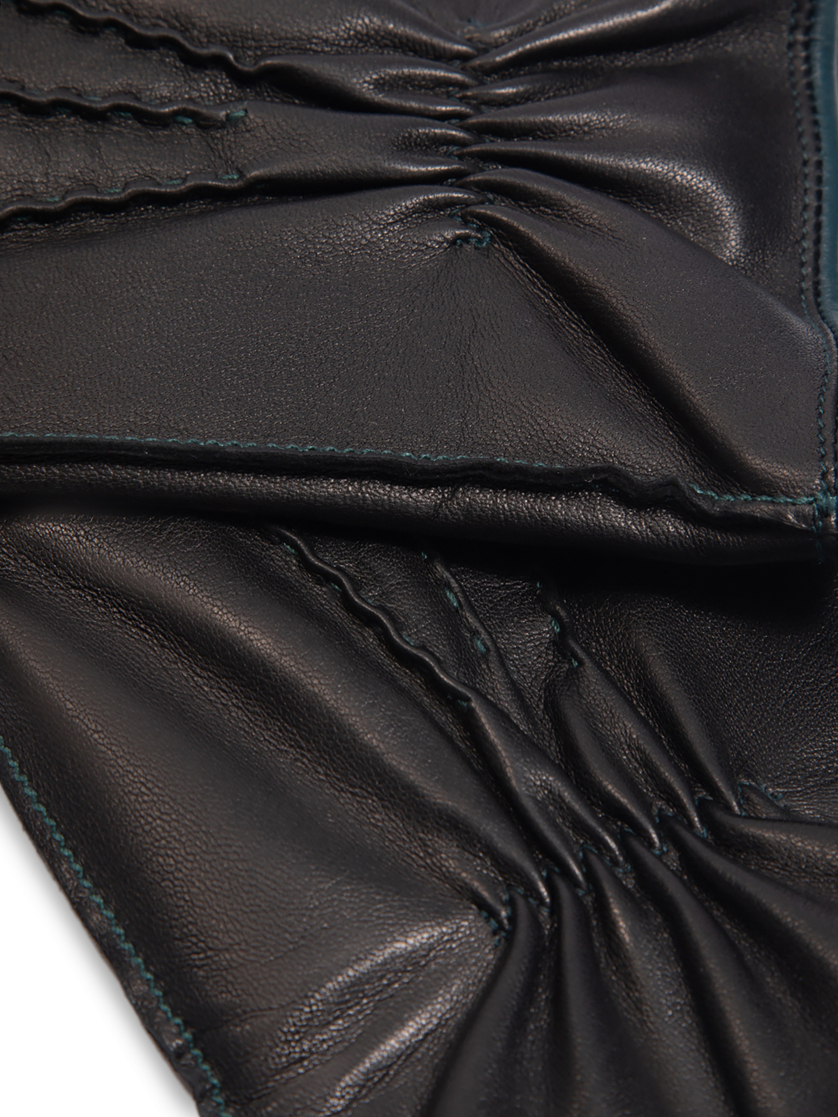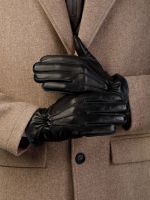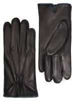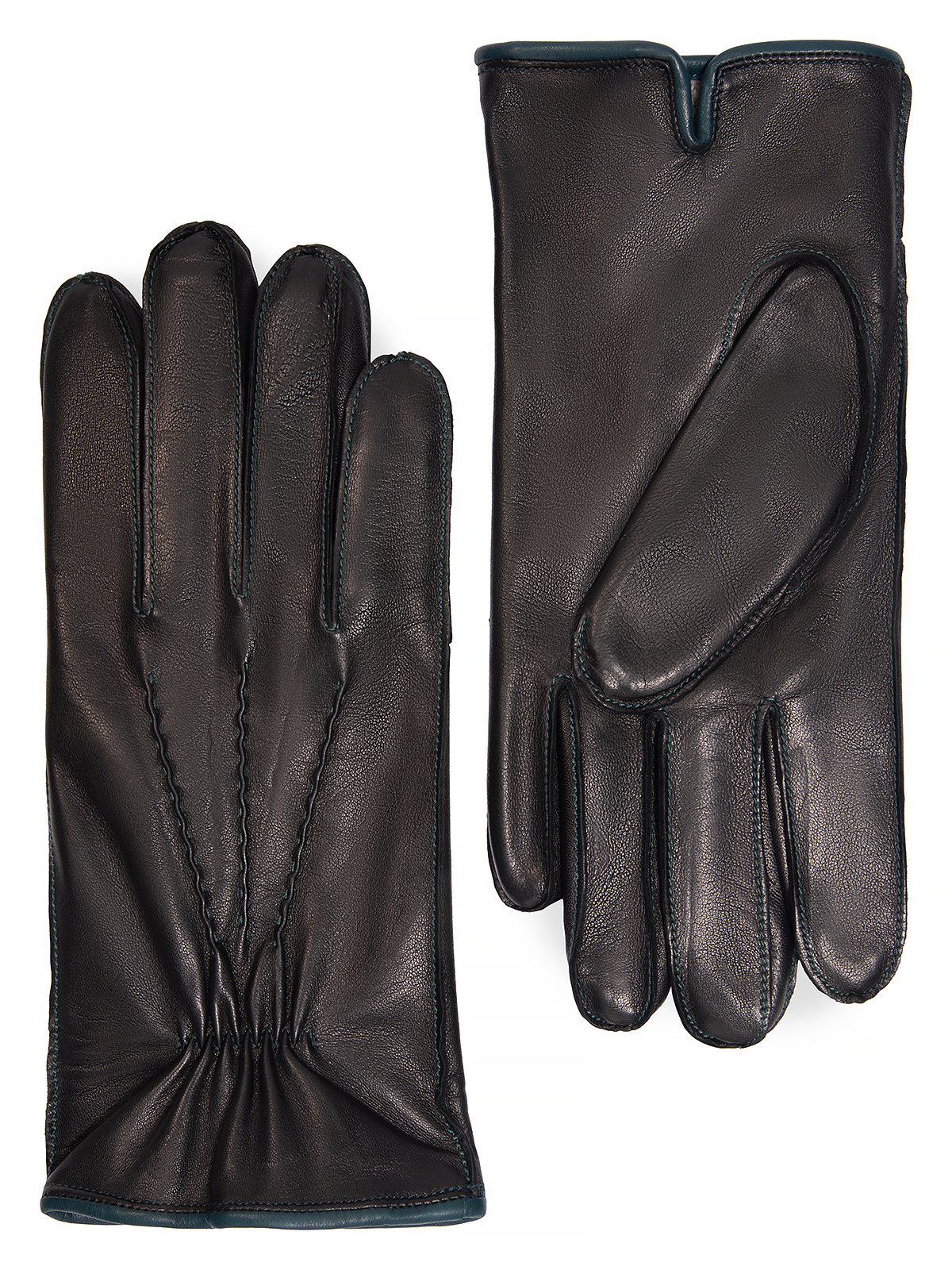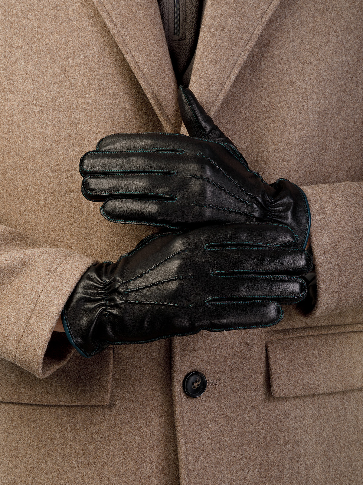 Перчатки торговой марки ELEGANZZA производства Италии выполнены из натуральной кожи черного цвета. Подкладка: 85%шерсть 15%кашемир. Отделка - декоративные швы три луча". На ладонной стороне разрез. Все строчки нитками и отделка края манжеты выполнены кожей контрастного темно-зеленого цвета. Длина манжеты от нижней точки большого пальца до края перчаток - 5 см. Длина пальцев - средняя."