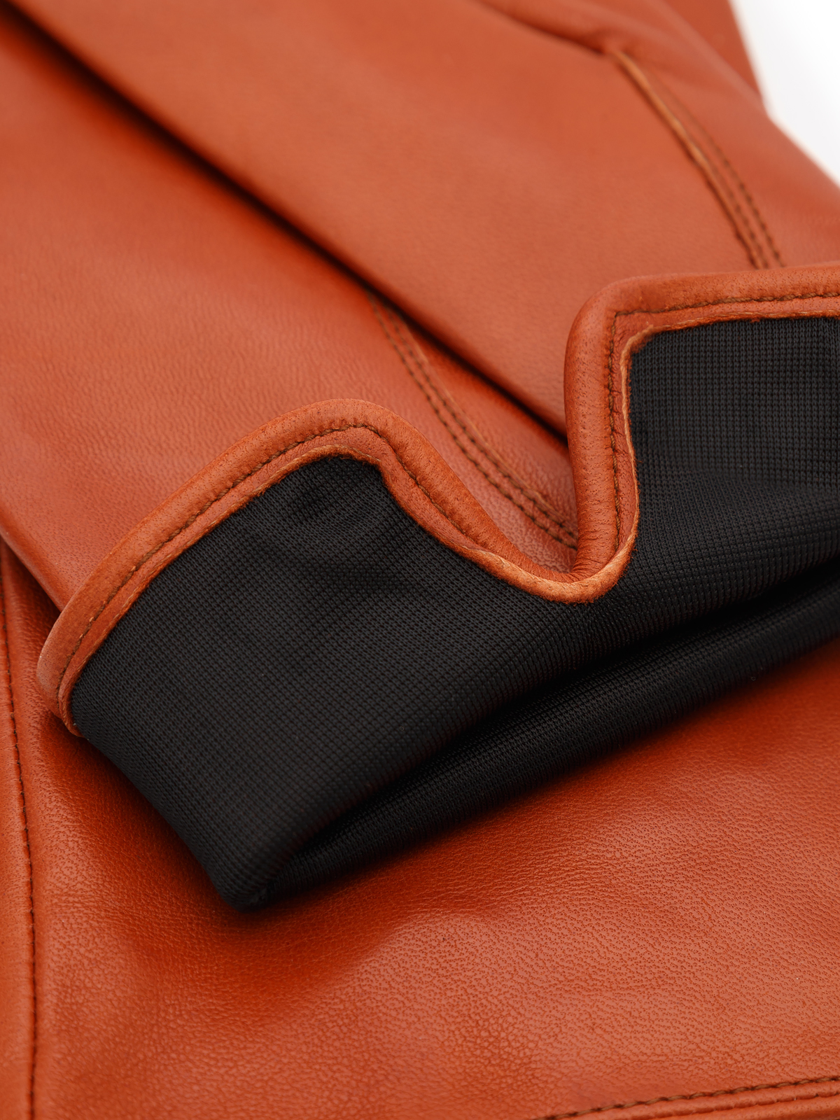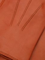 Перчатки торговой марки ELEGANZZA производства Италии выполнены из кожи ягнёнка коричневого цвета. Подкладка: шелк. Отделка - декоративные швы три луча". Нижний край перчатки и разрез на ладонной стороне (глубина 3 см) окантованы. Длина манжеты от нижней точки большого пальца до края перчаток - 45 см."