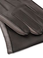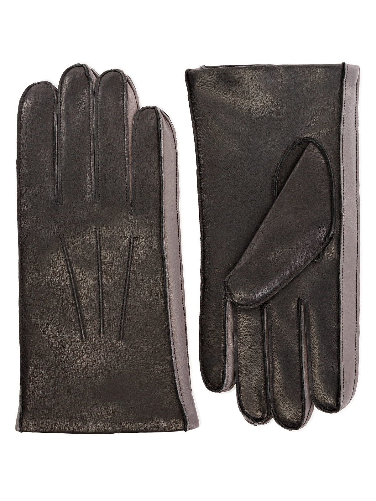 Перчатки мужские торговой марки ELEGANZZA из натуральной итальянской кожи ягненка. Подкладка: 85% шерсть 15% кашемир. Отделка - контрастные вставки из кожи по боковым швам и между пальцев. Длина манжеты от нижней точки большого пальца до края перчаток - 5 см. Длина пальцев - средняя.