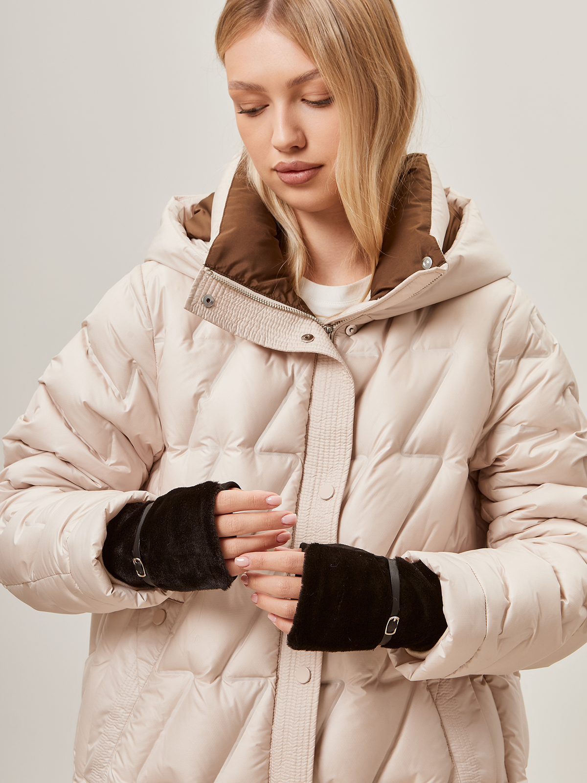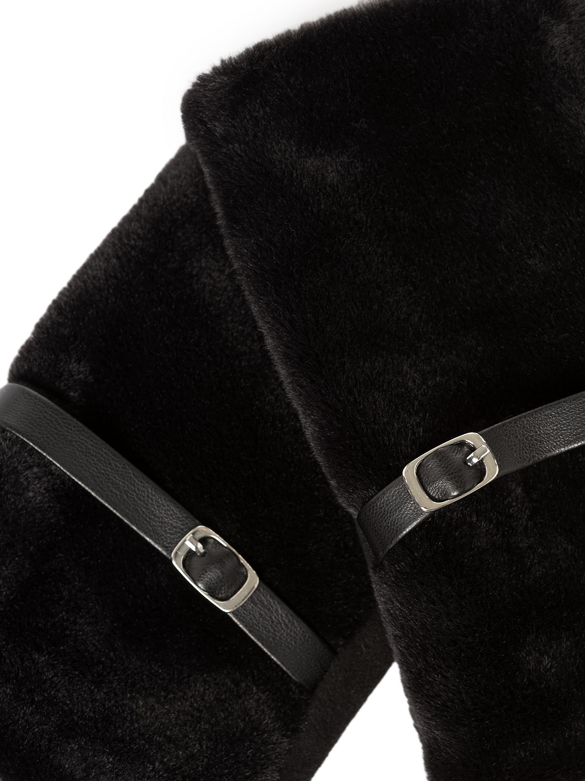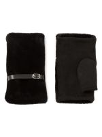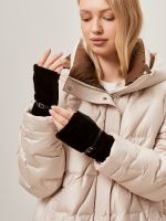 Митенки женские торговой марки LABBRA. Выполнены из трикотажа и дополнены искуссвенным мехом. Украшены лаконичным кожаным ремешком с небольшой металлической пряжкой. Модель со средней длиной пальцев и длиной манжеты от нижней точки большого пальца до края перчаток - 5 см.