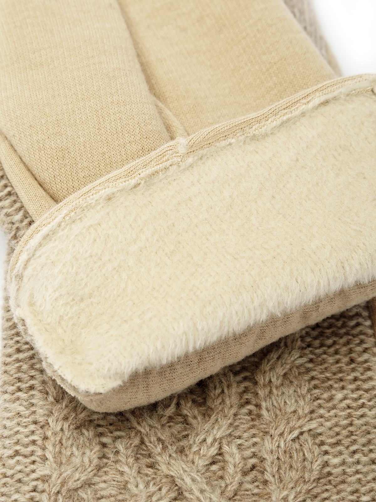 Перчатки торговой марки LABBRA производства Китай выполнены из трикотажа 100% полиэстер на внешней части и трикотажа 50% хлопок 50% полиэстер на ладонной части. Отделка - декоративная вязка в форме кос. Подкладка: флис 100% полиэстер. Длина манжеты от нижней точки большого пальца до края перчаток - 7 см. Длина пальцев - средняя. Модель перчатки универсального размера подойдёт на любую полноту руки благодаря хорошему стрейчу и эластичности трикотажа.