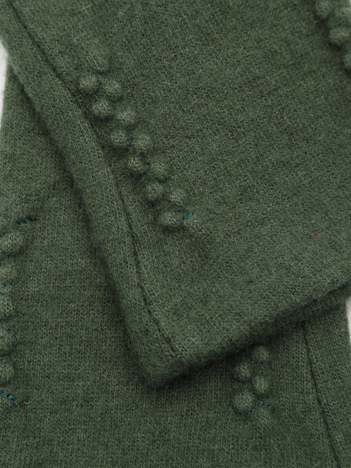 Перчатки торговой марки LABBRA производства Китай выполнены из трикотажной шерсти. Состав трикотажа: 80% шерсть 20% нейлон. Без подкладки. Отделка - декоративные вертикальные отстрочки на боковой части манжеты. Длина манжеты от нижней точки большого пальца до края перчатки 55 см. Длина пальцев - средняя.
