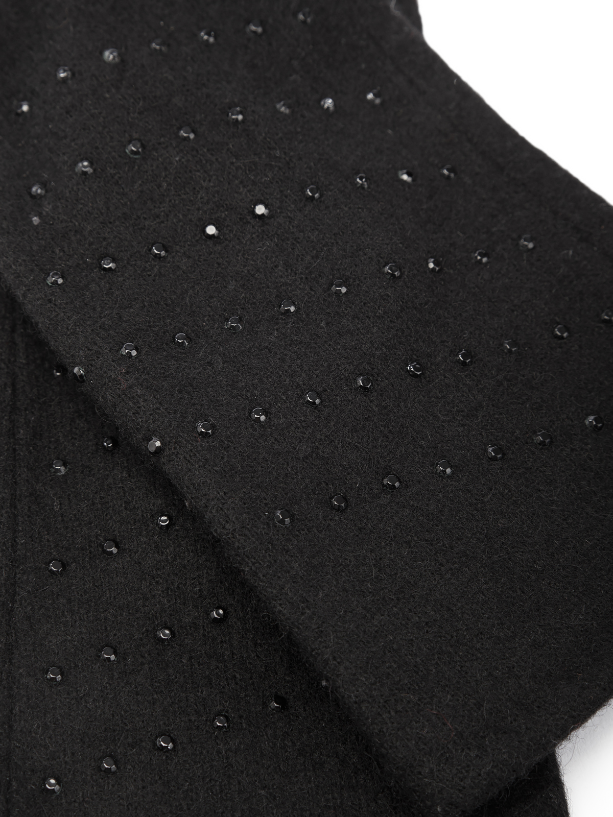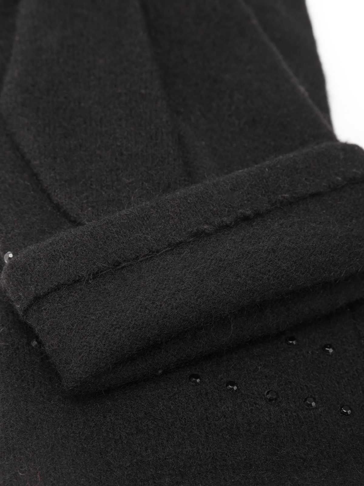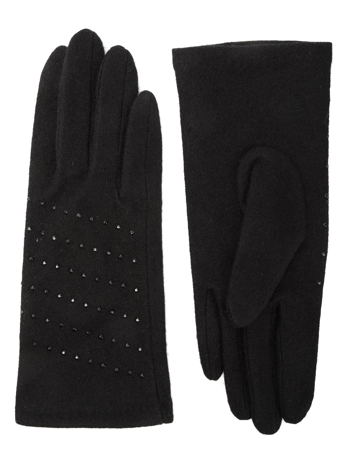 Перчатки торговой марки LABBRA производства Китай выполнены из трикотажной шерсти. Состав трикотажа: 80% шерсть 20% нейлон. Без подкладки. Отделка - диагональные полоски из страз в тон основному цвету на лицевой стороне. Длина манжеты от нижней точки большого пальца до края перчатки 6 см. Длина пальцев - средняя.