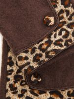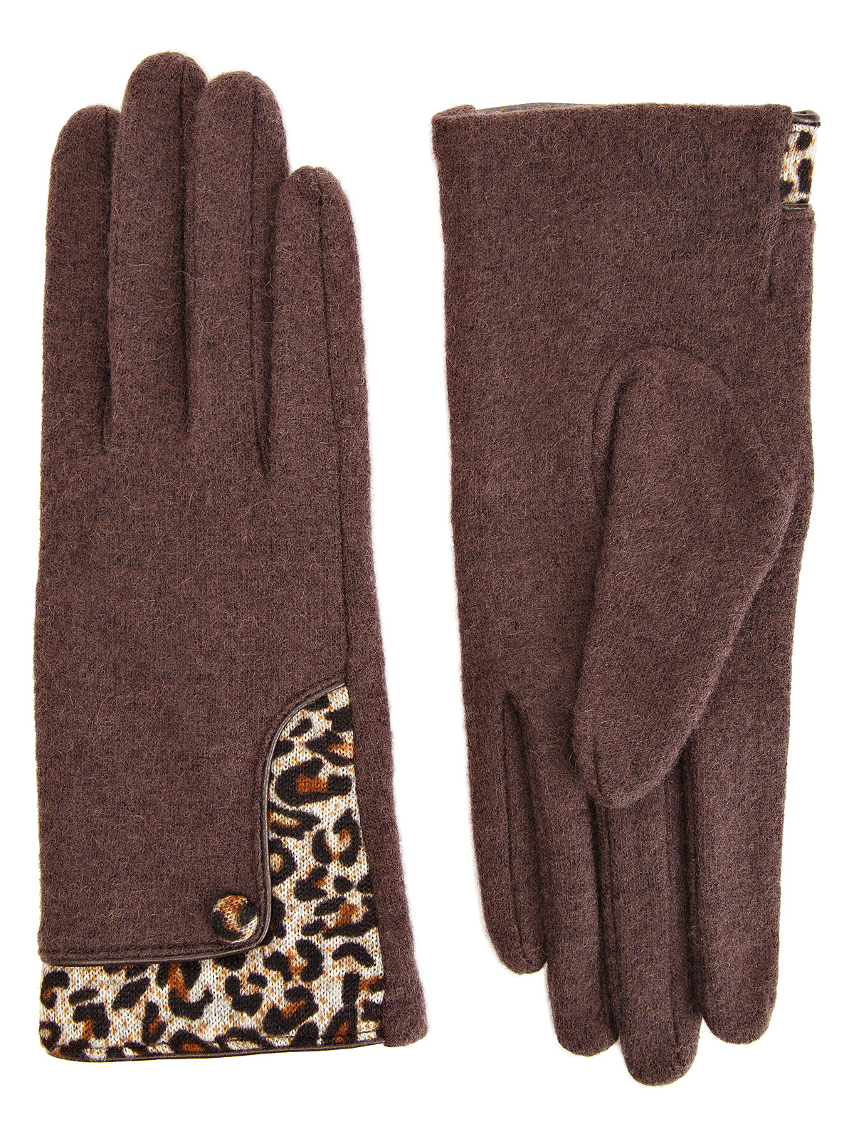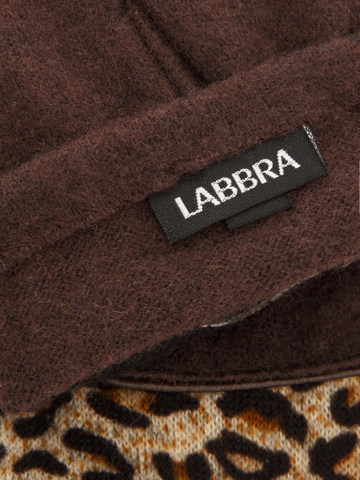 Перчатки торговой марки LABBRA производства Китай выполнены из трикотажной шерсти. Состав трикотажа: 80% шерсть 20% нейлон. Без подкладки. Отделка - декор из трикотажа с анималистичным принтом в нижней части манжеты на лицевой стороне. Длина манжеты от нижней точки большого пальца до края перчатки 6 см. Длина пальцев - средняя.