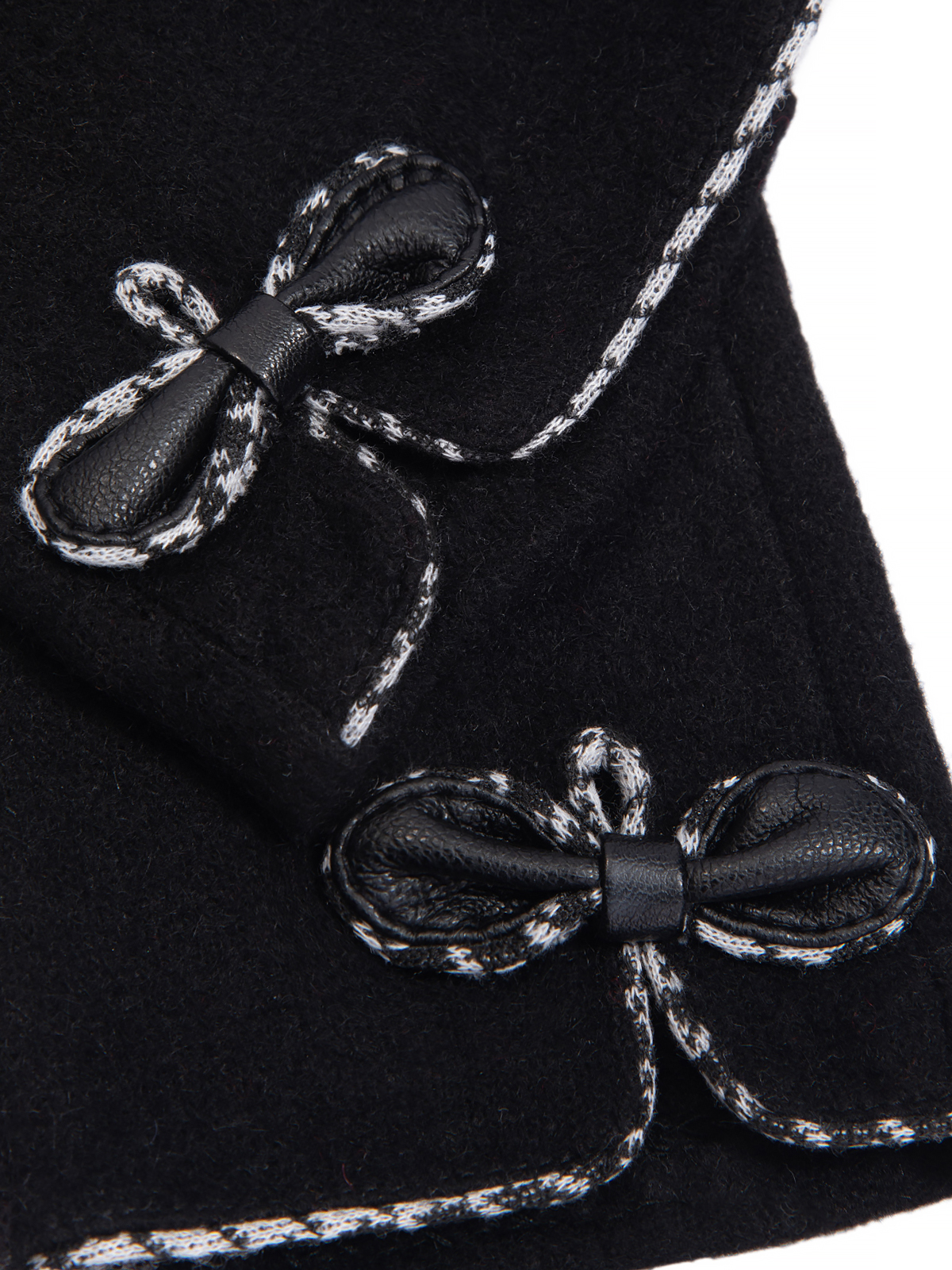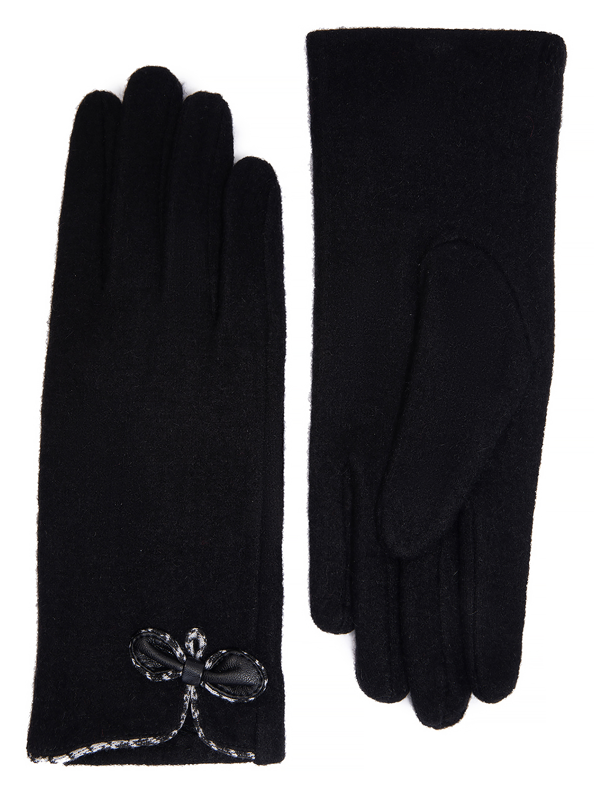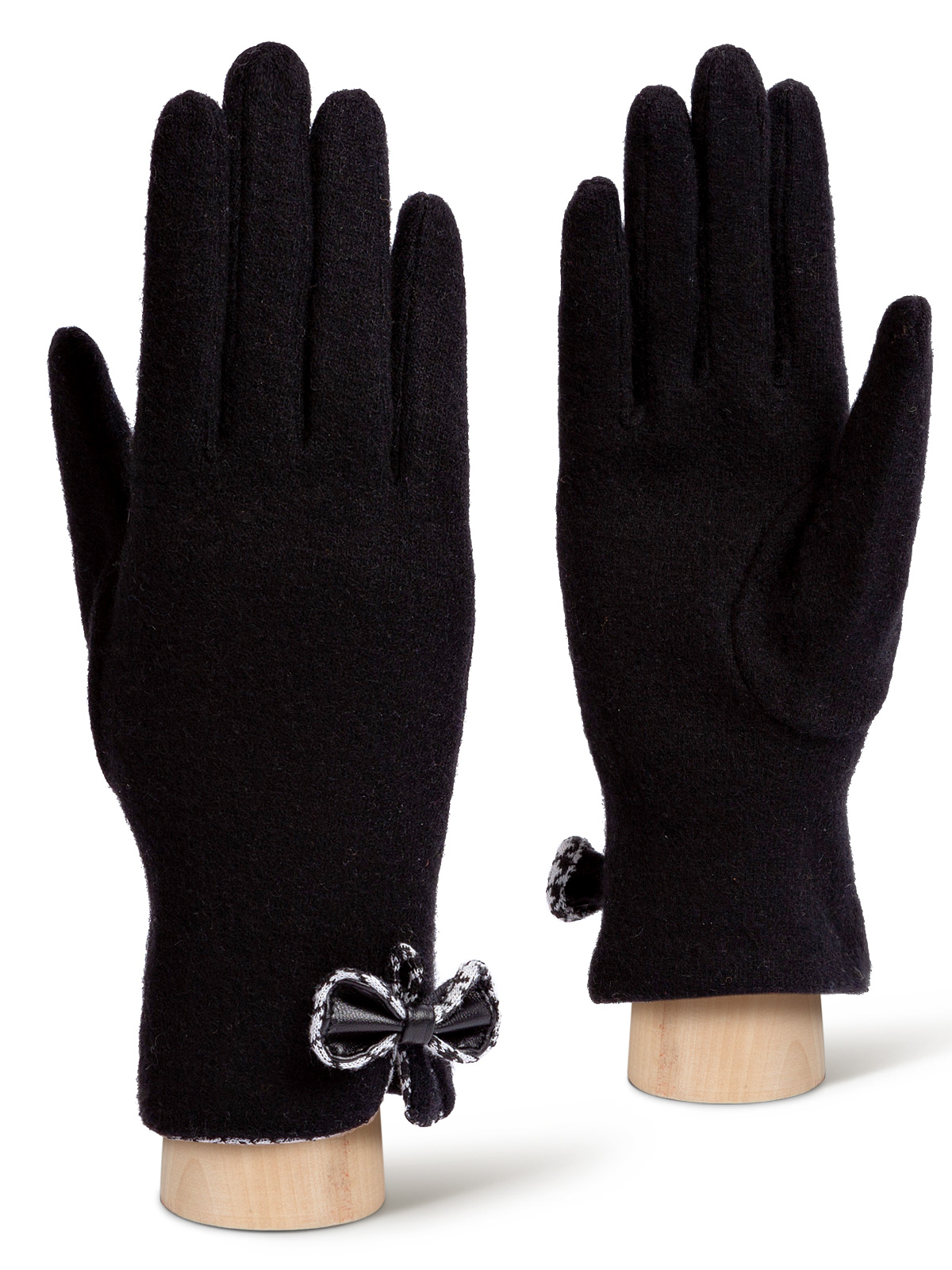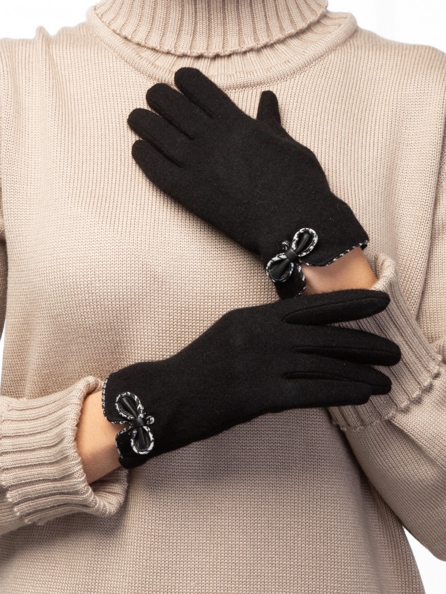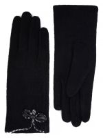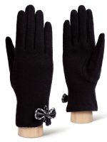 Перчатки женские торговой марки LABBRA производства Китай выполнены из трикотажной шерсти. Состав трикотажа: 80% шерсть 20% нейлон. Отделка - декоративный рисунок бантик обрамляет разрез в виде капельки. Отделка по краю манжеты трикотажем с принтом гусиная лапка". Длина манжеты от нижней точки большого пальца до края перчатки - 6.5 см. Длина пальцев - средняя."