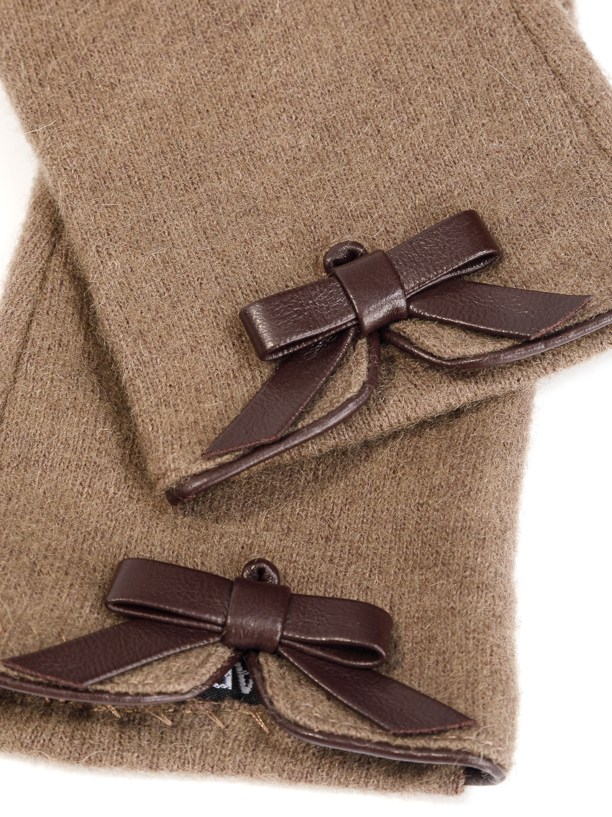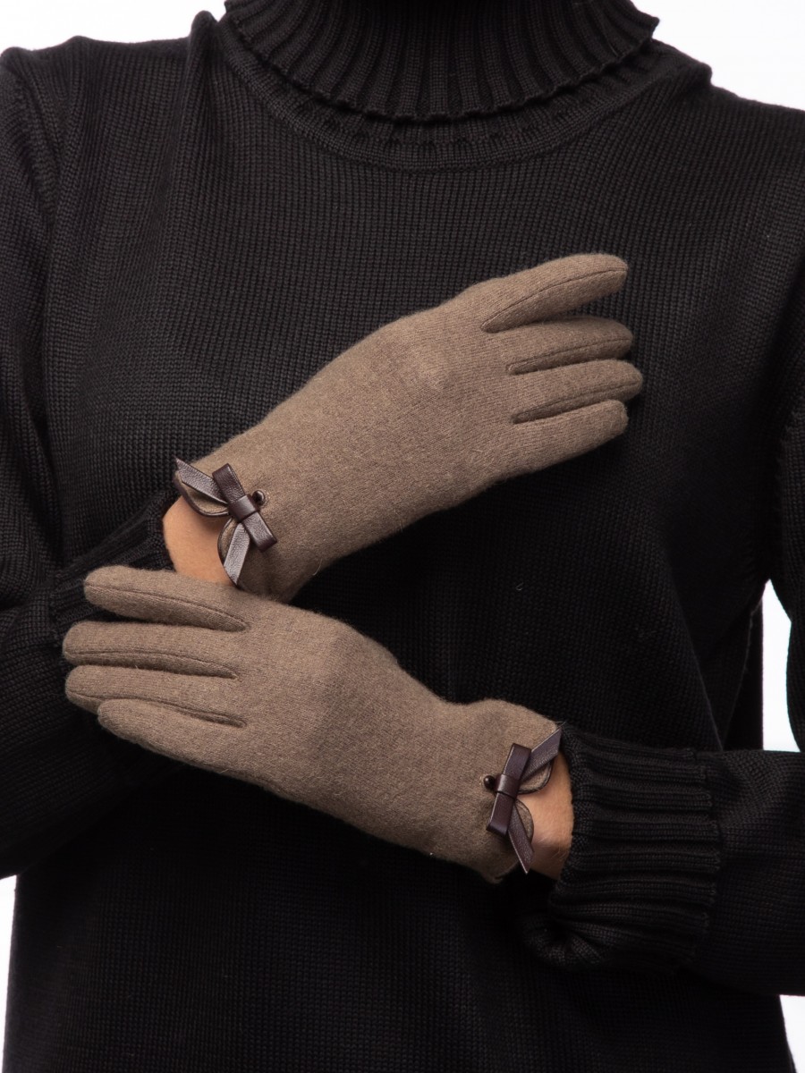 Перчатки торговой марки LABBRA производства Китай выполнены из трикотажной шерсти. Состав трикотажа: 80% шерсть 20% нейлон. Без подкладки. Отделка - декоративный бантик и край манжеты выполнены из заменителя кожи. Длина манжеты от нижней точки большого пальца до края перчатки - 6 см. Длина пальцев - средняя.