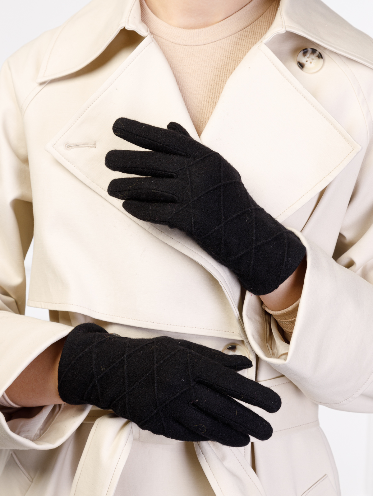 Перчатки торговой марки LABBRA производства Китай выполнены из трикотажной шерсти. Состав трикотажа: 80% шерсть 20% нейлон. Без подкладки. Отделка - декоративные строчки ромбами на лицевой стороне. Длина манжеты от нижней точки большого пальца до края перчатки 5 см. Длина пальцев - средняя.