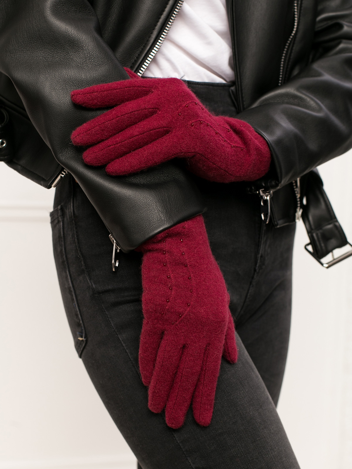 Перчатки торговой марки LABBRA производства Китай выполнены из трикотажной шерсти. Состав трикотажа: 80% шерсть 20% нейлон. Без подкладки. На лицевой стороне перчатки декоративная отстрочка и бисер. Длина манжеты от нижней точки большого пальца до края перчатки - 55 см. Длина пальцев - средняя.