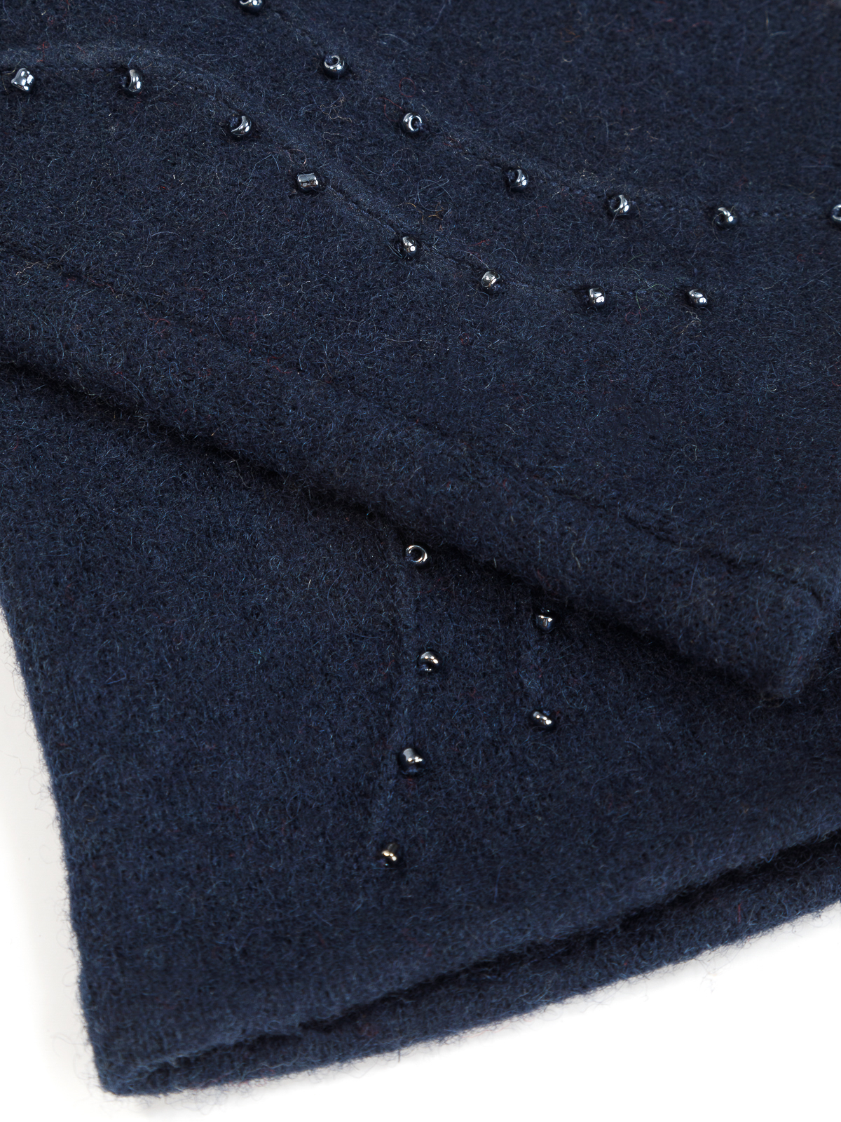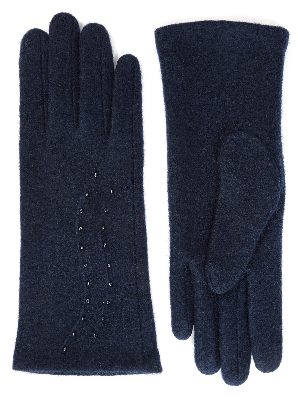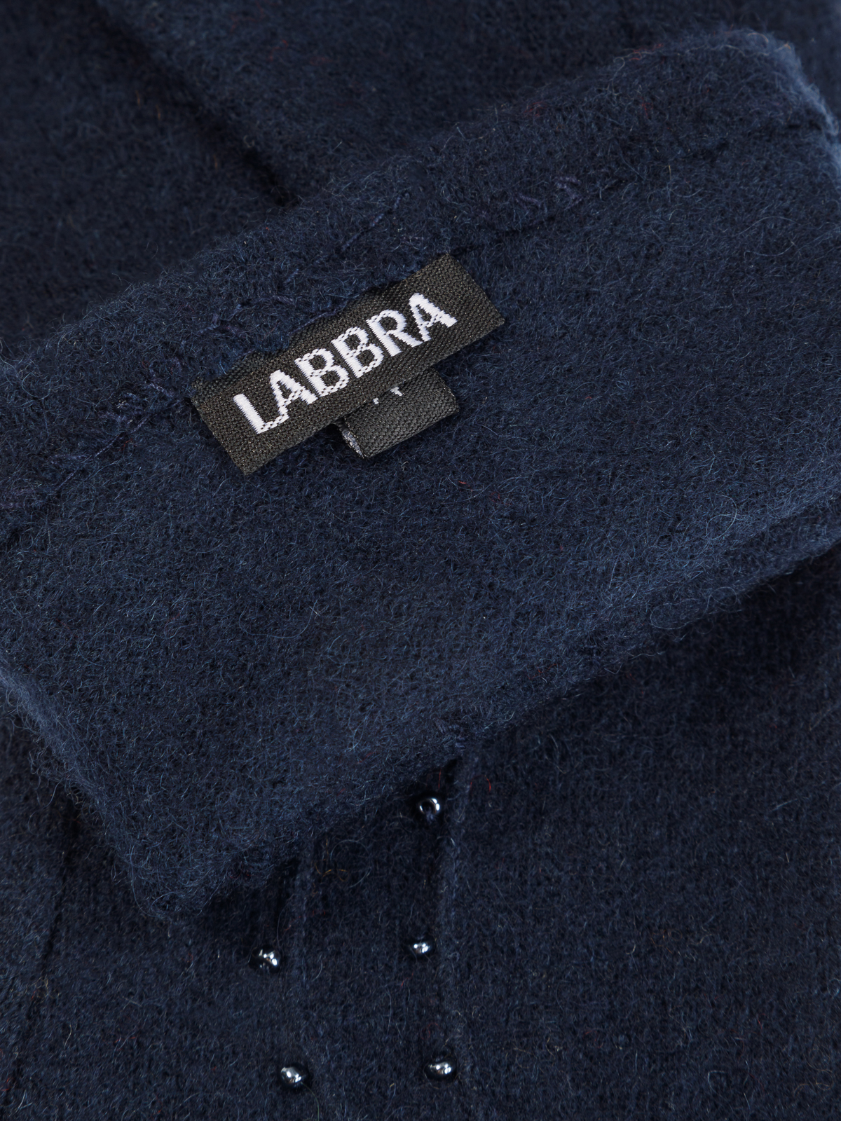 Перчатки торговой марки LABBRA производства Китай выполнены из трикотажной шерсти. Состав трикотажа: 80% шерсть 20% нейлон. Без подкладки. На лицевой стороне перчатки декоративная отстрочка и бисер. Длина манжеты от нижней точки большого пальца до края перчатки - 55 см. Длина пальцев - средняя.
